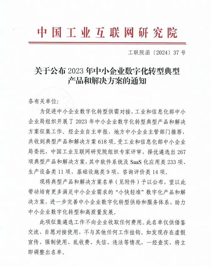 为促进中小企业数字化转型供需对接,工业和信息化部中小企业局组织开展了2023年中小企业数字化转型典型产品和解决方案征集工作。经企业自主申报、地方中小企业主管部门推荐,共收到典型产品和解决方案618项。受工业和信息化部中小企业局委托,中国工业互联网研究院组织专家评审,择优遴选出267项典型产品和解决方案,其中软件系统及SaaS化应用类233项、生产设备类11项、基础设施类9项、咨询评价类14项。