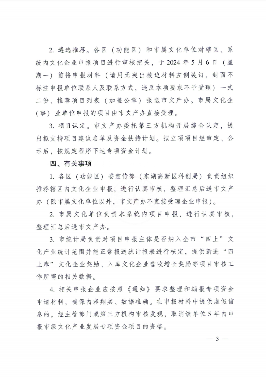 现将武汉市文化体制改革与文化产业发展领导小组办公室《关于组织申报2024年武汉市文化产业发展资金项目(第一批)的通知》转发给你们(附件1),请对照通知中的申报要求认真准备申报材料,其中:申报材料纸质文本(格式需按照通知要求)一式二份,于2024年5月6日(星期一)12:00前送至东湖高新区科技创新和新经济发展局(光谷公共服务中心2号楼4010办公室);申报材料电子文档发送邮箱:295824633@qq.com。