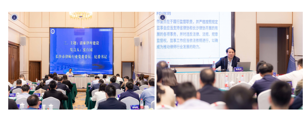 培训分别邀请了中南大学马克思主义副院长胡晓主讲《中国道路的发展历程》;湖南省律协监事、五届长沙市律协监事长赵海洋主讲《长沙律协监事会发展概述及协会章程解读》;市律师行业党委委员、纪委书记,市律协监事长张自国主讲《清廉律所建设》《长沙律协监事会工作规则解读》,课程从协会监事会发展、清廉律所建设、监督工作方式、履职基本要求等主题进行了深入细致的分享。