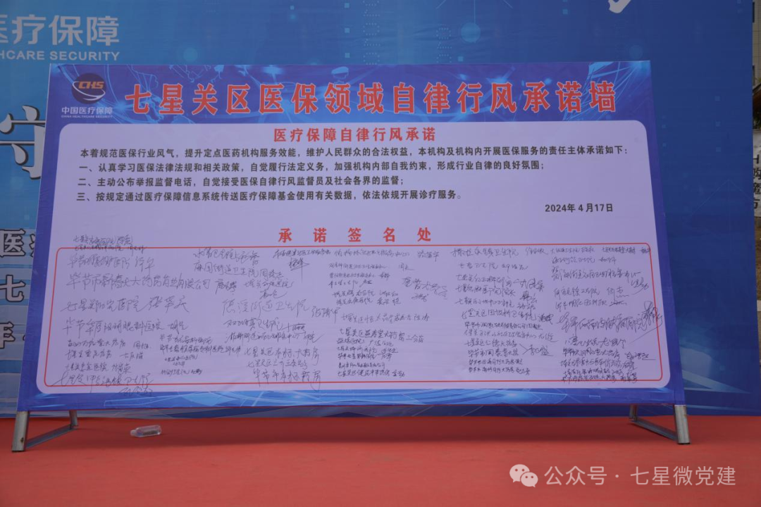 仪式上,七星关区各定点医疗机构、零售药店主要负责人在“七星关区医保领域自律行风承诺墙”上签名承诺:着力规范医保行业风气,提升定点医药机构服务效能,维护人民群众的合法权益;认真学习医保法律法规和相关政策,自觉履行法定义务,加强机构内部自我约束,形成行业自律的良好氛围;主动公布举报监督电话,自觉接受医保自律行风监督员及社会各界的监督;按规定通过医疗保障信息系统传送医疗保障基金使用有关数据,依法依规开展诊疗服务。