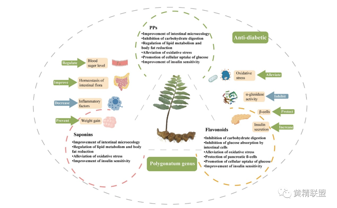 黄精多糖均为非淀粉多糖,含量可高达26.61%。一方面其生品及其制品均不含淀粉,不存在由于摄入大量淀粉而血糖飙升的现象;另一方面黄精多糖可以通过改善肠道微生态、防治肥胖、抑制α-葡萄糖苷酶活性、促进胰岛素分泌、抗氧化等多种机制调节血糖。