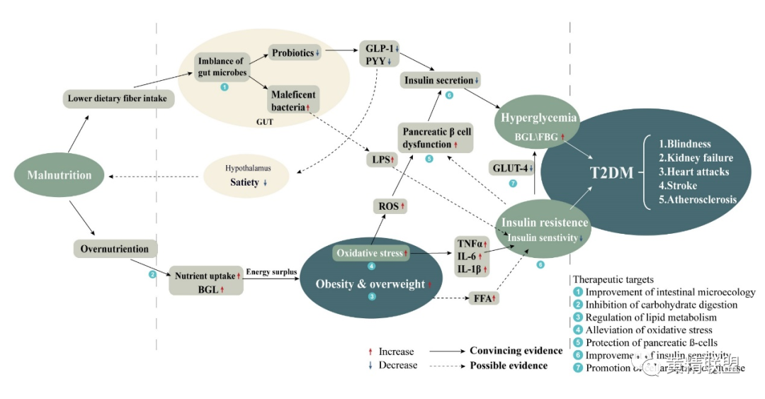 图1 T2DM在肠道和全系统的病因和治疗靶点