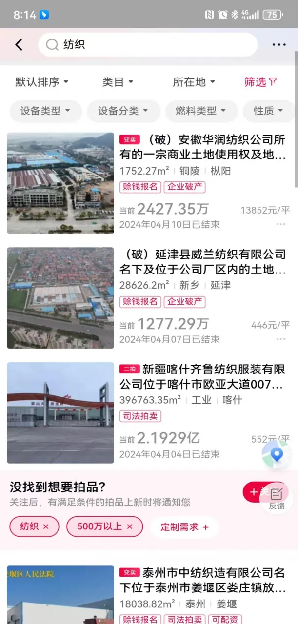 近年来,织造产业进入了快速洗牌阶段,洗牌意味着强者愈强,产业整体技术的进步,但同样的,在竞争中落败的纺织企业,不少就逃不脱被拍卖的命运。打开阿里拍卖,我们发现,仅仅4月前10天,已经完成的价值超过500万元的纺织企业拍卖已经达到了7宗,仅有福州市立峰纺织有限公司名下位于长乐区漳港街道渡桥村的房产及土地及机器设备被以4760万的价格拍下,其余6宗皆流拍。而拍卖成功的家纺织厂,整体评估价是高达8494万元,这次拍卖的成交价比评估价少了三千多万元,折算下来6折不到。而等待拍卖的纺织厂以及在拍卖中的纺织机械设备,更是不胜枚举。4月3日,在清明节前,在福州市网上司法拍卖市场上,迎来了一宗重量级的房产拍卖,一家纺织厂被打包拍卖了。此次拍卖的是福州市立峰纺织有限公司名下位于长乐区漳港街道渡桥村的房产及土地及机器设备,爱企查显示,福州市立峰纺织有限公司成立于1994年11月04日,也是一家老牌纺织厂,注册资本1个亿,可惜现在已经被列为失信人了,纺织厂也空置不生产了。此次拍卖的纺织厂,起拍价为4760万元,最终,拍卖结束的时候,只有一个人报名竞拍,以起拍价就拿下了该纺织厂。此次拍卖的纺织厂,土地使用权面积25584平方米,房屋总建筑面积:50945.92平方米,(其中,与房屋所有权证证载面积一致的建筑物建筑面积合计11,151.47㎡,与房屋所有权证载面积不符或尚未办理产权证的建筑物建筑面积合计39,794.45㎡),拍卖的建筑物主要有一栋超大的建筑以及铁硼厂房等。整个工厂内还有大量的纺织机械设备和原料等。其中机器设备有细纱机、豪猪开棉机、梳棉机、棉纺清花生产线、复合圆笼除尘机组、梳针辊筒开棉机等,一共有560台。此次拍卖的纺织厂,交通区位非常不错,地处福州机场高速和福州绕城高速交汇的江朱枢纽的东侧,胪峰大道旁边。该纺织厂整体评估价是高达8494万元,这次拍卖的成交价比评估价少了三千多万元。不过该纺织厂此前也进行过两次拍卖了,但都是以流拍而告终,起拍价分别是5950万元和4760万元。因为此次拍卖,还包括了各种纺织机器设备,所以,想买下该纺织厂的,最好也是跟纺织有关的企业。而从竞拍结果来看,最后的竞得者也是一家纺织企业,叫做福州旭源顺针织有限公司。不过该公司比较年轻,今年3月14日才成立,成立不到一个月。从成立时间来看,有很大可能就是为竞拍该纺织厂而成立的公司,公司注册资本也不高,只有500万元。据中国长丝织造协会统计,截至2023年底,我国长丝织造行业织机规模达到92.7万台,其中喷水织机85.5万台,同比增长11.04%。2023年全年我国化纤长丝织物总产量达到631亿米,同比增长6.05%。在2018年,喷水织机的数量仅仅在40万台左右,5年时间翻了一倍还多。而631亿米布,约等于全球80亿人,平均卖给每个人8米布,虽然近年来市场在不断扩张,却远远赶不上产能增长的速度。因此近些年,“卷”字成为了纺织市场的主流。伴随着织造产能的持续增长,纺织行业的洗牌还将继续。来源:阿里拍卖、最靓长乐、中国长丝织造协会、化纤邦、网络