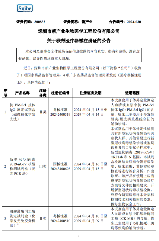 新产业4月17日晚间发布公告称,近日,深圳市新产业生物医学工程股份有限公司收到了1项国家药品监督管理局、4项广东省药品监督管理局颁发的《医疗器械注册证》。包括“抗PM-Scl抗体IgG测定试剂盒”等产品。