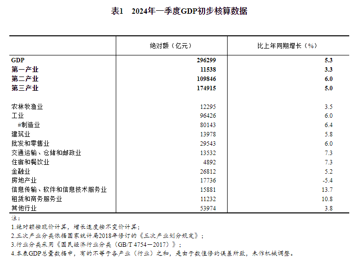 国家统计局4月16日发布,2024年第一季度国内生产总值(GDP)为296299亿元,按不变价格计算,同比增长5.3%,比上年四季度环比增长1.6%。