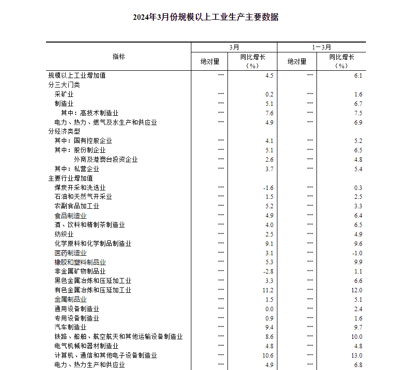 从工业总体状况来看,一季度全国规模以上工业增加值同比增长6.1%,增速较去年四季度加快0.1个百分点;其中,制造业增加值增长6.7%,增速较去年四季度加快0.4个百分点,继续保持着回升向好的趋势。根据国家统计局数据初步测算,一季度工业增长对GDP增长的贡献率约为37.3%,拉动了将近2个百分点的GDP增长。