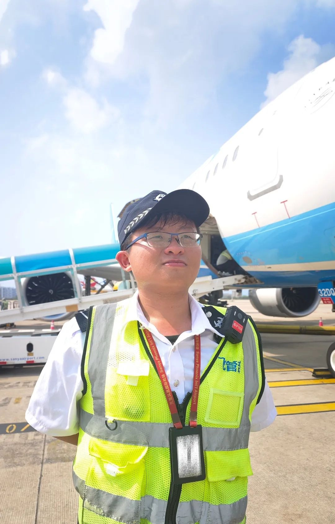 在繁忙的停机坪上,阳光洒在每一架即将起飞的飞机上,反射出耀眼的光芒,旅客们也在陆续登机中。身着制服佩戴执勤帽的监护员何声辉正手持对讲机,眼神坚定,时刻关注着飞机周围的安全情况,全神贯注地执行着机下监护任务。此时在登机队伍后方正有一名旅客双手拎着背包,边走边用脚推着行李箱缓慢地随着登机队伍向前挪动,何声辉见状,立刻走上前去,主动询问旅客的需求,并帮助该名旅客将行李箱送至舱门口。