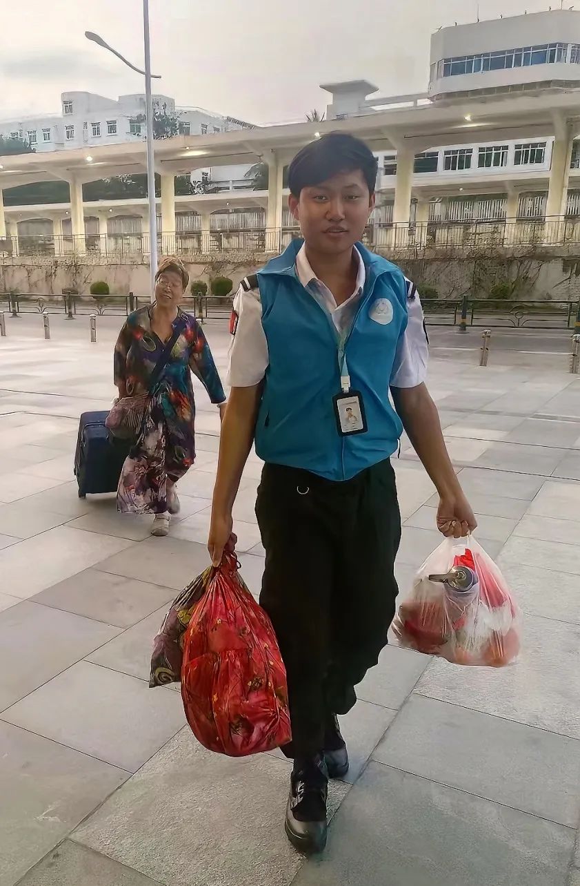 在机场公交站,一位阿姨提着大包小包的行李艰难的行走着,这一幕正好被维序员毛栋诚发现,在得知阿姨是第一次坐飞机后,他便主动上前接过旅客的行李,引导前往航站楼办理乘机手续,确保阿姨能够顺利出行。