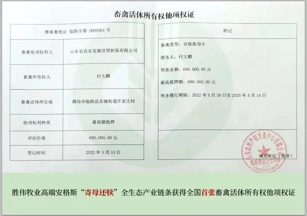 胜伟在全国范围内创造了首张《畜禽活体所有权他项权证》,完成肉牛真正意义上的活体抵押,实现活体生物数字化、数字资产化、资产金融化、金融证券化,打破了千百年来“家有万贯带毛的不算”的传统观念,具有划时代的意义。