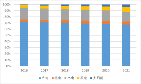 虽然近年来我国将重点发展核电、新能源发电,但目前火力发电规模依然占比非常大。2021年我国发电结构中,约70%的发电量来自于火电,但是2014-2021年的发电量结构变化能够看出我国火电发电占比处于逐渐下降趋势,风电、光伏、核能等其他能源发电占比逐渐升高。