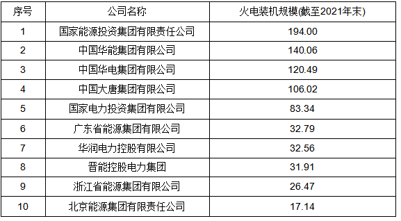 截至2021年末,我国火力发电企业主要包括华能集团、国家能源、浙能集团等。具体情况如下表所示: