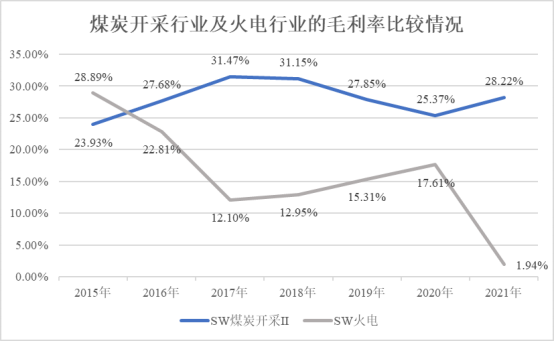 2015年至2021年,煤炭开采行业(SW煤炭开采Ⅱ)、火电行业(SW火电)毛利率比较情况如下: