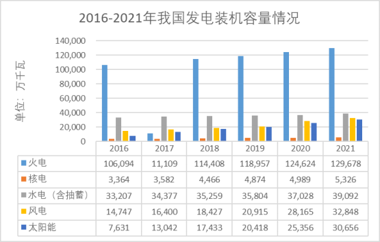 根据中国电力企业联合会数据统计,2021年全国电力工业发电量为83,768亿千瓦时,较上年增长9.8%,其中,火力发电56,463亿千瓦时,太阳能发电3,270亿千瓦时;全年发电装机容量237,692万千瓦,较上年增长7.9%,其中,火力发电装机容量为129,678万千瓦,太阳能发电装机容量为30,656万千瓦。