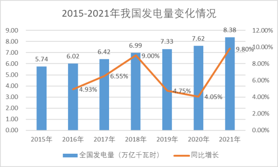 2015年至2021年我国发电量变化情况如下: