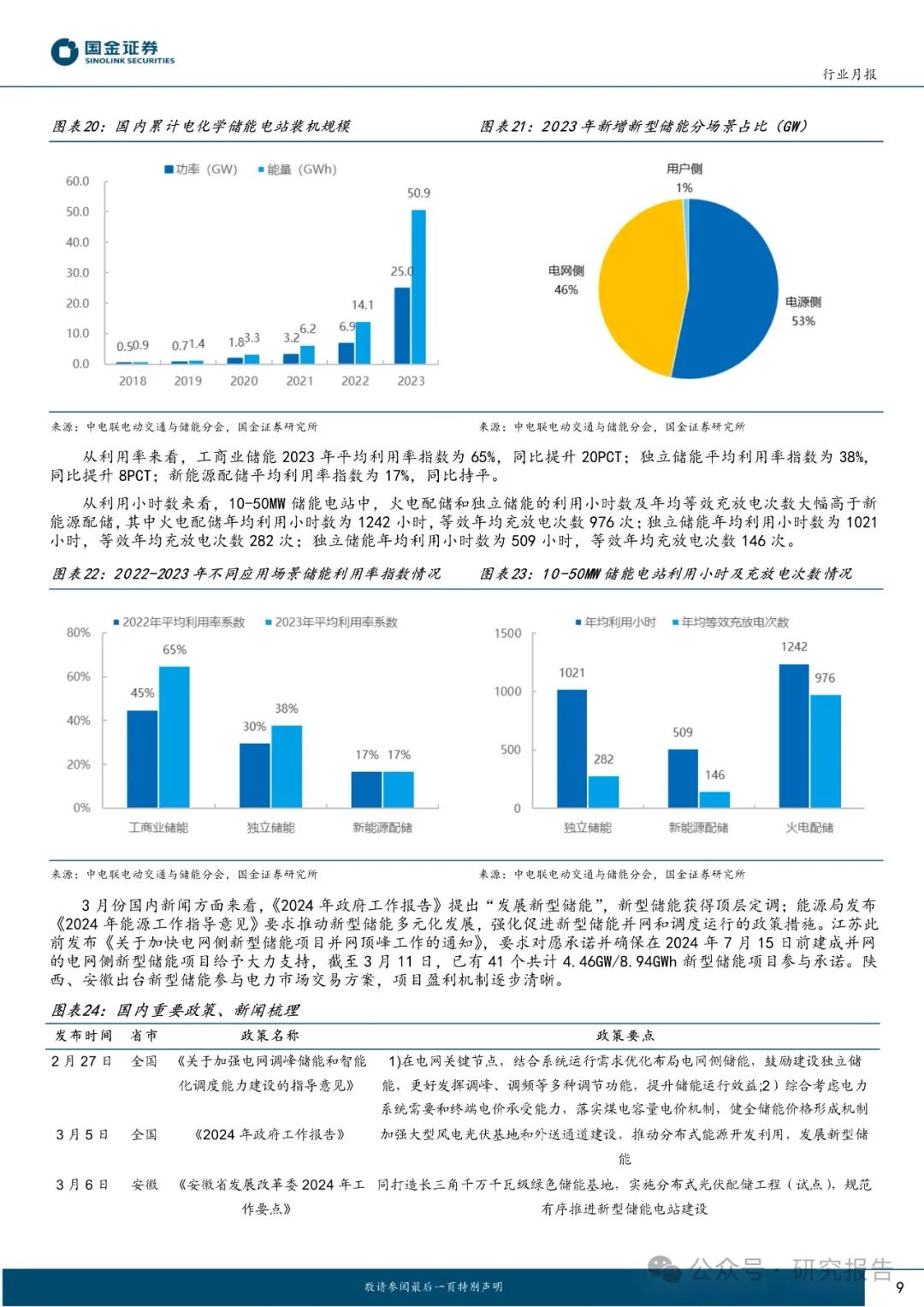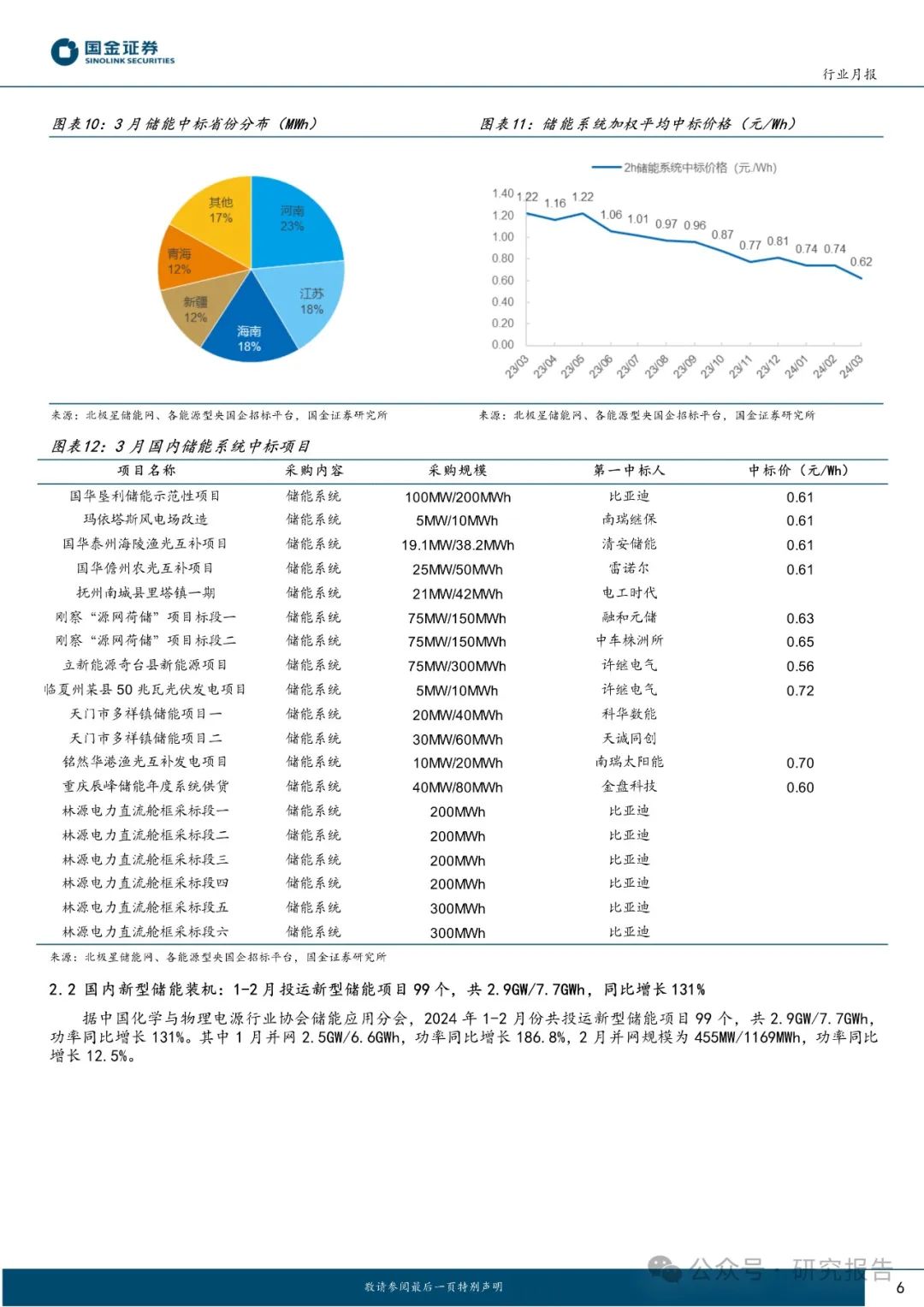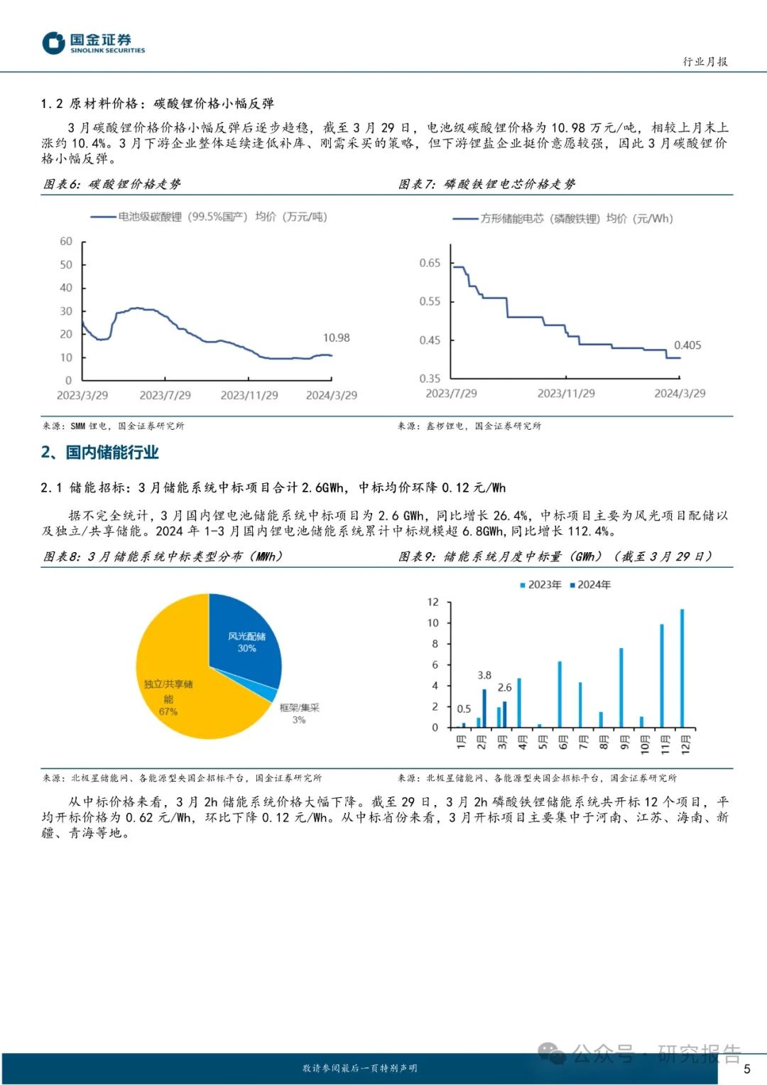 因此 3 月碳酸锂价格小幅反弹。据不完全统计,3 月国内锂电池储能系统中标项目为 2.6 GWh,同比增长 26.4%,中标项目主要为风光项目配储以及独立/共享储能。2024 年 1-3 月国内锂电池储能系统累计中标规模超 6.8GWh,同比增长 112.4%。