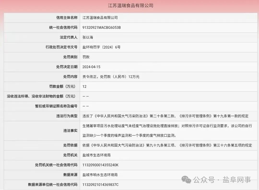 江苏温瑞食品有限公司因生猪屠宰项目污水处理站废气未经废气治理设施处理直接排放;对照排污许可证自行监测要求,该公司的自行监测缺少一个季度的噪声监测和一个季度的废气排放口监测。