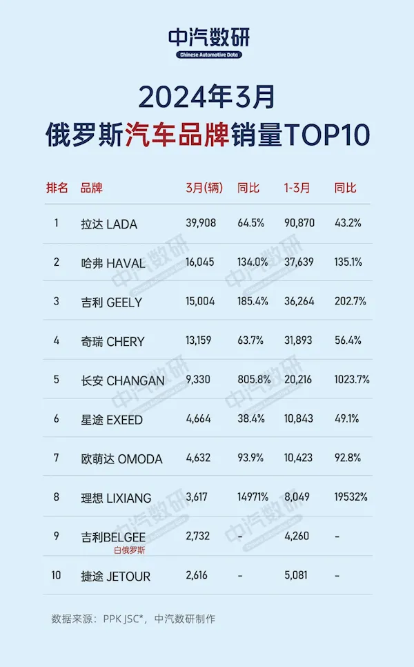 中汽数研发布了“2024年3月俄罗斯汽车品牌销量TOP10”榜单,有品牌同比暴增14971%
