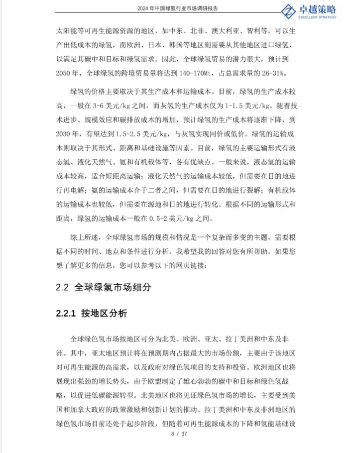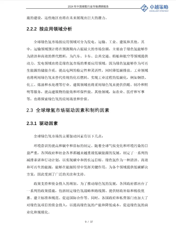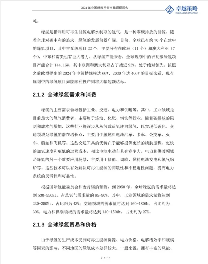 绿氢的主要需求领域包括工业、交通、电力和供暖等。其中,工业领域是目前最大的氢气消费者,主要用于炼油、化肥、钢铁等行业。随着碳排放的限制和成木的增加,这些行业将逐步从灰氢或蓝氢转向绿氢,以实现低碳化。交通领域足绿氢的潜在增长点,主要用于氢燃料电池汽车、卡车、公交车、火车、船舶和飞机等。