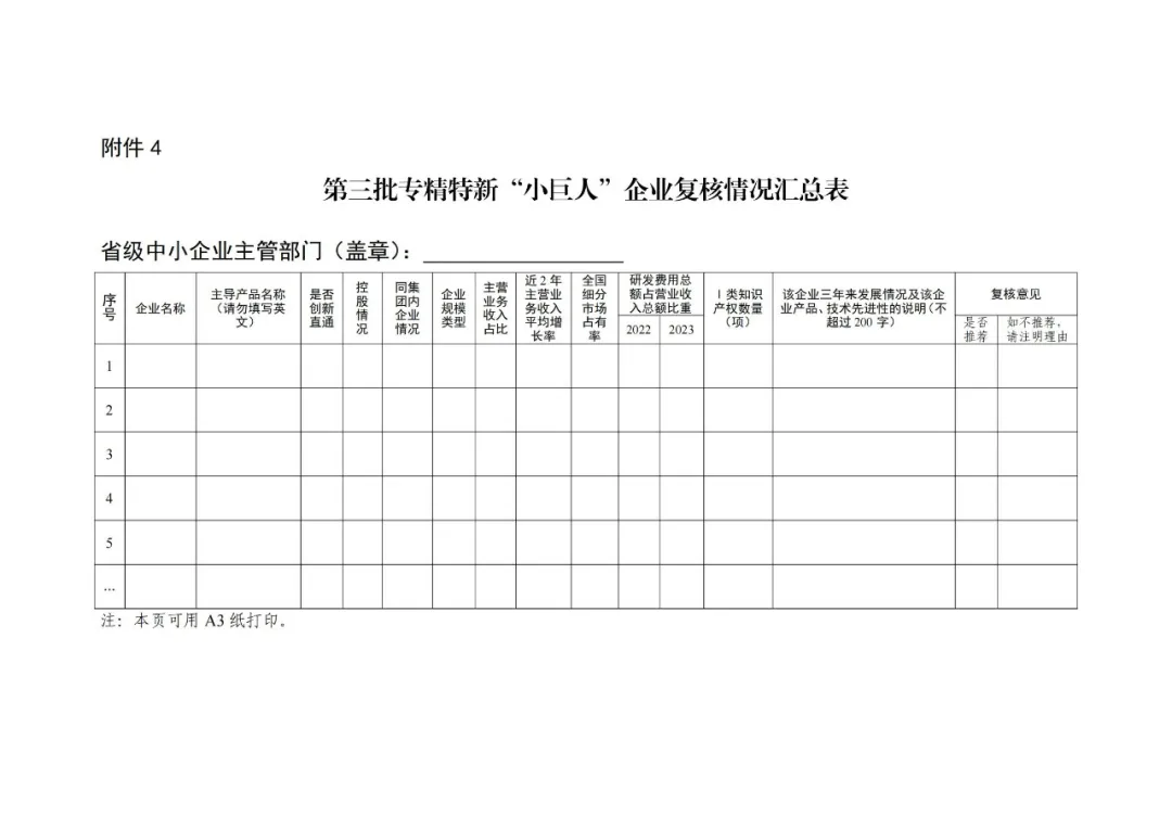 (七)省级中小企业主管部门于2024年5月20日至6月15日集中开展初核推荐工作,期间可根据工作需要,联系已完成申请企业补充上传佐证材料。于2024年6月15日前将加盖公章的正式文件、第六批专精特新“小巨人”企业申请书(附件1,申请企业需加盖公章)、第三批专精特新“小巨人”企业复核申请书(附件2,申请企业需加盖公章)、第六批专精特新“小巨人”企业推荐汇总表(附件3)、第三批专精特新“小巨人”企业复核情况汇总表(附件4),各一份通过邮政特快专递(EMS)邮寄至:工业和信息化部中小企业局创业创新处。