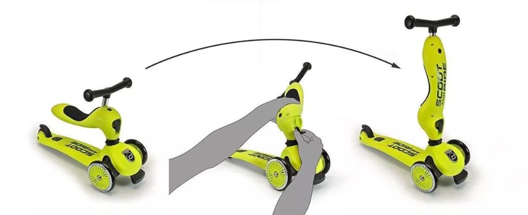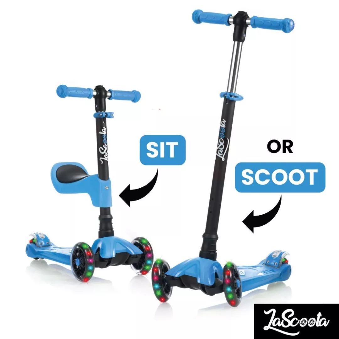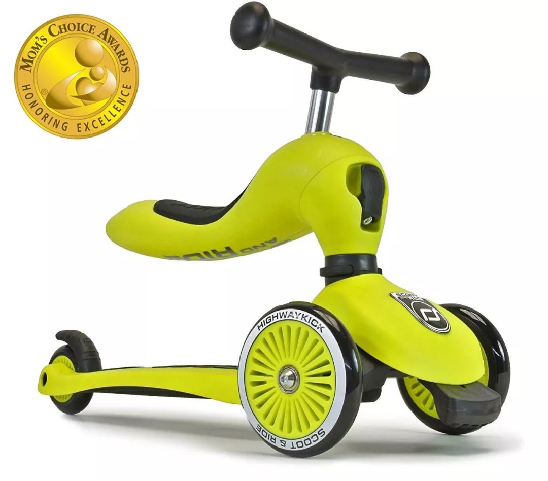 LaScoota这款滑板车在美亚上有1000+的好评,也是可以坐着骑、可以站着滑两种模式,底板也设计的很宽,在颠簸的道路上也能保证宝宝平稳安全的行驶。车把手有四种高度可以调节,适合不同年龄段的宝宝玩,性价比也很高。这款滑板车还有一个亮点是车轮周围会发光,宝宝绝对会被吸引!