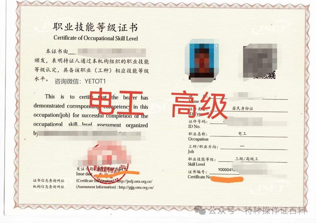 从事职业:电工(俗称等级证),分类:我国职业资格证书分为五个等级:初级(五级)、中级(四级)、高级(三级)三级/高级职业资格证书(英文) 、技师(二级)二级职业资格证书(技师)样本图 和高级技师(一级)新版一级职业资格证书样本。