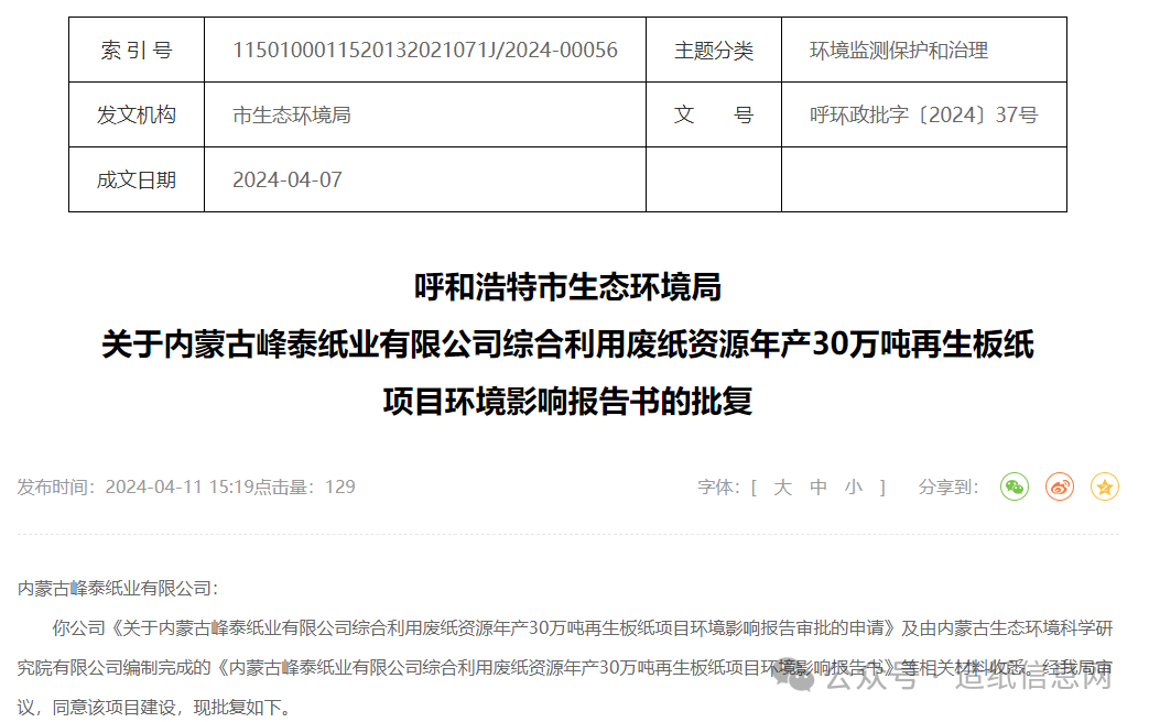近日,呼和浩特市生态环境局发布《关于内蒙古峰泰纸业有限公司综合利用废纸资源年产30万吨再生板纸项目环境影响报告审批的申请》,同意该项目建设。