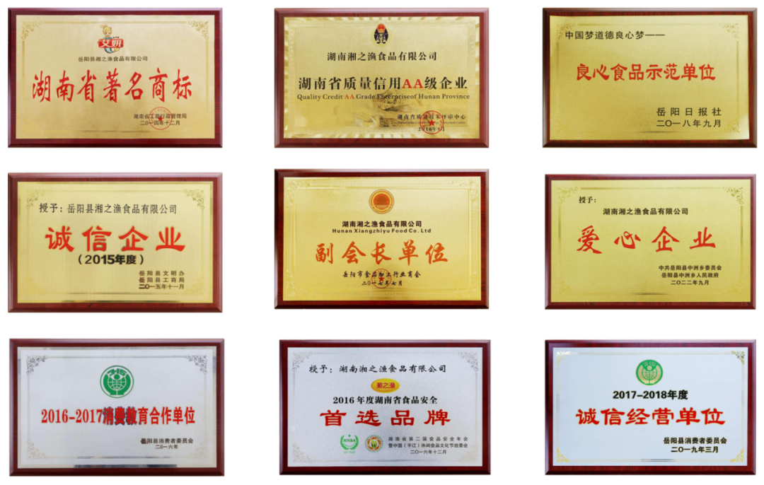 公司品牌“艾妍”、“中洲渔馆”品牌先后荣获“湖南著名商标”“湖南省品牌产品”公司被评为“创新管理优秀企业”“消费者满意单位”“诚信企业”“岳阳市行业副会长单位”等十余项荣誉。
