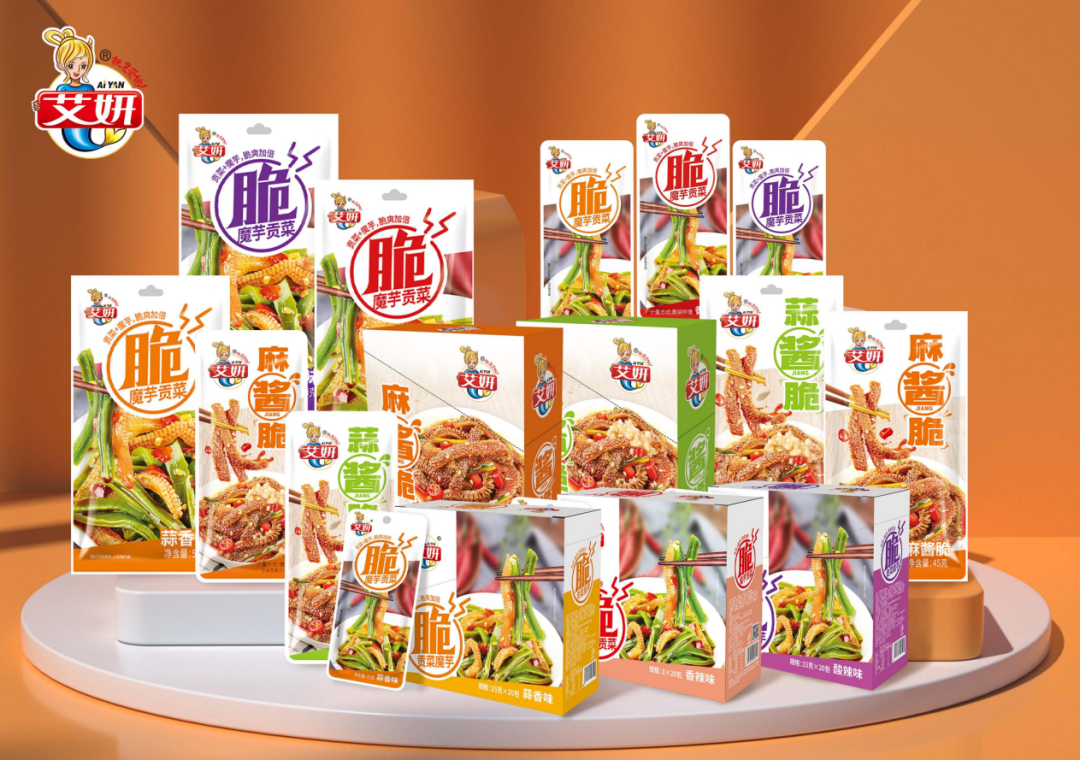 艾妍食品旗下,多款休闲食品品牌如同璀璨星辰,其中艾妍魔芋贡菜系列,以其独特的口感和营养价值,成为2023年行业内备受追捧的热点产品。这一系列不仅风靡全国29个省市,更赢得了市场的广泛赞誉。