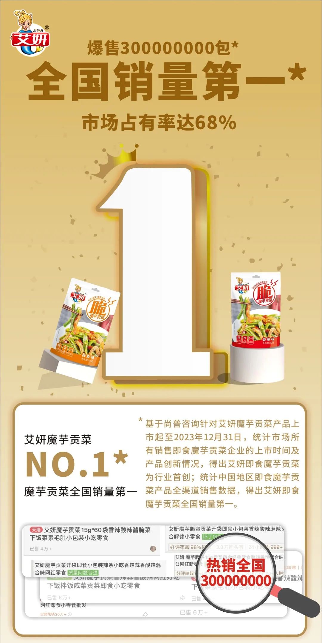 艾妍魔芋贡菜上市三个月累计销售突破30万件,在同类产品市场中占有率高达68%,2023年全年累计销售超3亿包,为2023年即食魔芋贡菜产品全国销量第一。