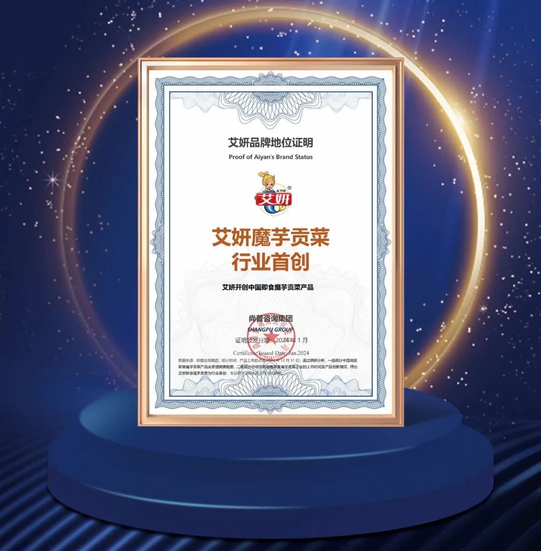 在第三方权威机构尚普咨询的严格评审下,针对艾妍魔芋贡菜产品上市起至2023年12月31日,统计市场所有销售即食魔芋贡菜企业的上市时间及产品创新情况,艾妍食品旗下产品艾妍魔芋贡菜,荣获“魔芋贡菜行业首创”证明,成为当之无愧的行业首创。