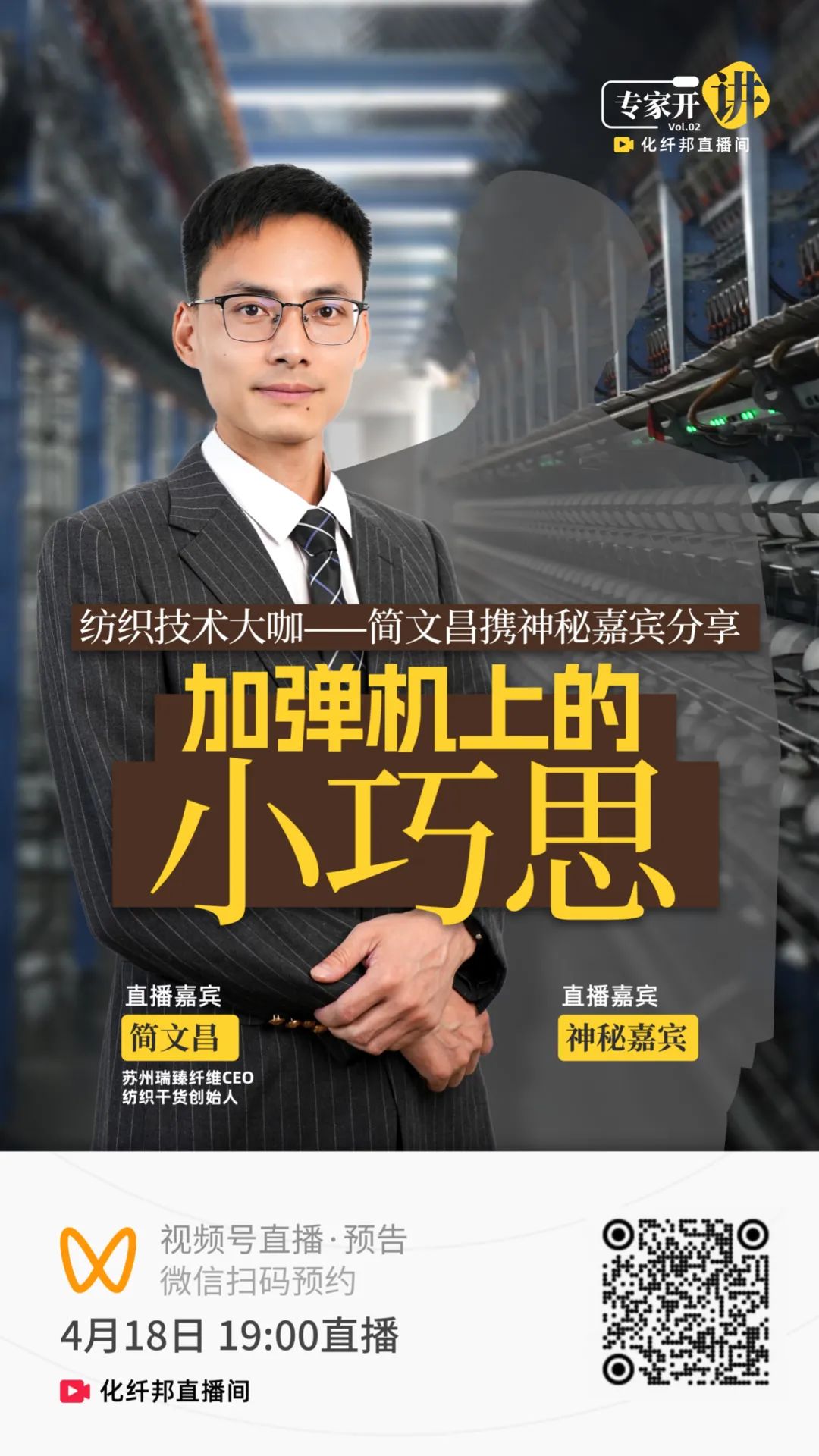 4月18日(周四)19点,苏州瑞臻纤维CEO,纺织干货创始人简文昌将携手神秘嘉宾做客化纤头条直播间,分享一些关于加弹机油剂的使用,历史,现状和未来趋势相关知识。