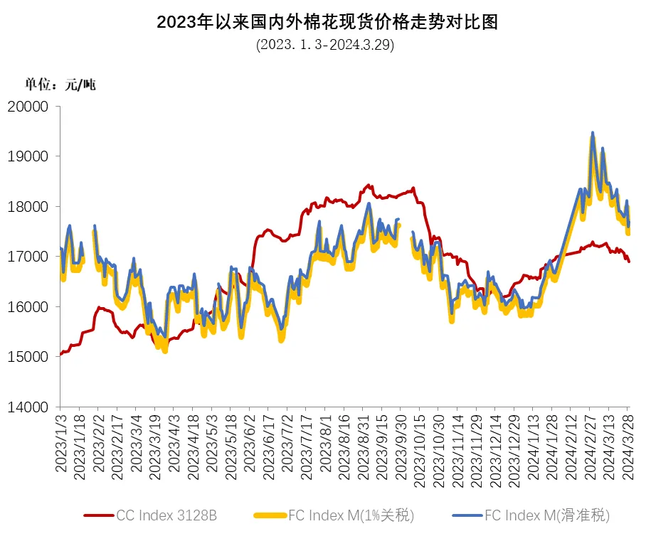 3月,月初美棉签约出口强劲,助力ICE期棉主力合约上行至100美分/磅附近,之后USDA发布2024/25年度美棉意向面积同比增加,同时美联储降息预期推迟,美元指数上涨,给棉价造成压力,ICE期棉主力合约最低回落至90.51美分/磅。3月ICE期棉主力合约月均结算价在93.91美分/磅,环比上涨1.31美分,涨幅1.4%。中国进口棉价格指数FCIndex M月均为104.06美分/磅,环比上涨2.24美分;月底为100.68美分/磅,环比下跌10.29美分,1%关税下折人民币17557元/吨,高于同期中国棉花价格指数(CCIndex3128B)662元。