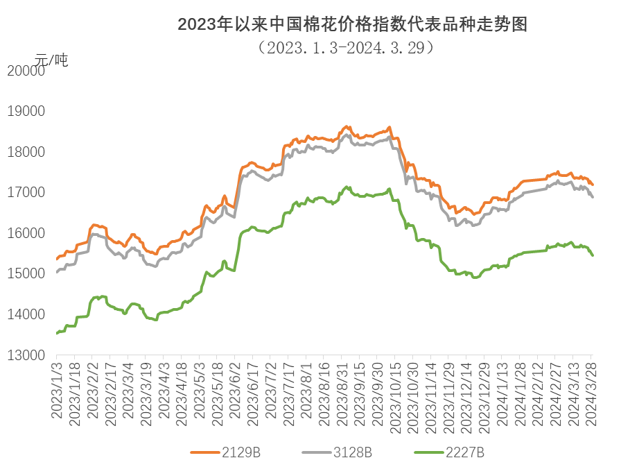 3月,纺织市场但受气温偏低等因素影响,春季订单推迟,需求整体疲软,旺季不旺特征明显,销售情况不及预期,成品库存积压,部分企业下调开机率,原料采购谨慎,以随用随买为主,棉花价格总体回落,29日中国棉花价格指数(CCIndex3128B)收于全月最低点,为16895元/吨。国际市场,美联储降息预计将推迟,美元指数上涨,对棉价形成压力,即使美棉出口装运创年内新高,但棉价依然下行,ICE期棉主力合约回落至90美分/磅附近,外棉跌幅大于国内。