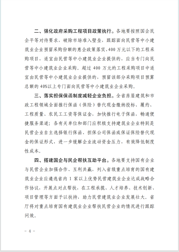 强化政府采购工程项目政策执行。400万元以下工程采购项目,应向中小建筑业企业采购;超过400万元的工程采购项目中适 宜由民营等中小建筑业企业提供的,预留该部分采购项目预算 总额的 40%以上专门面向民营等中小建筑业企业采购。