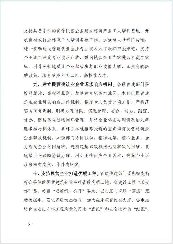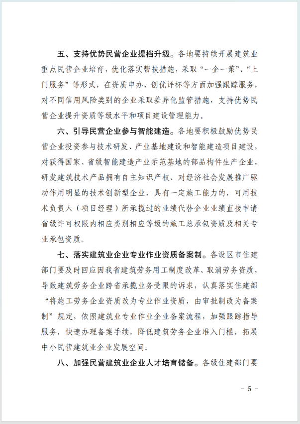 支持优势民营企业提档升级。采取“一企一策”、“上 门服务”等形式,在资质申办、创优评杯等方面加强跟踪服务,支持优势民 营企业提升资质等级水平和项目建设管理能力。