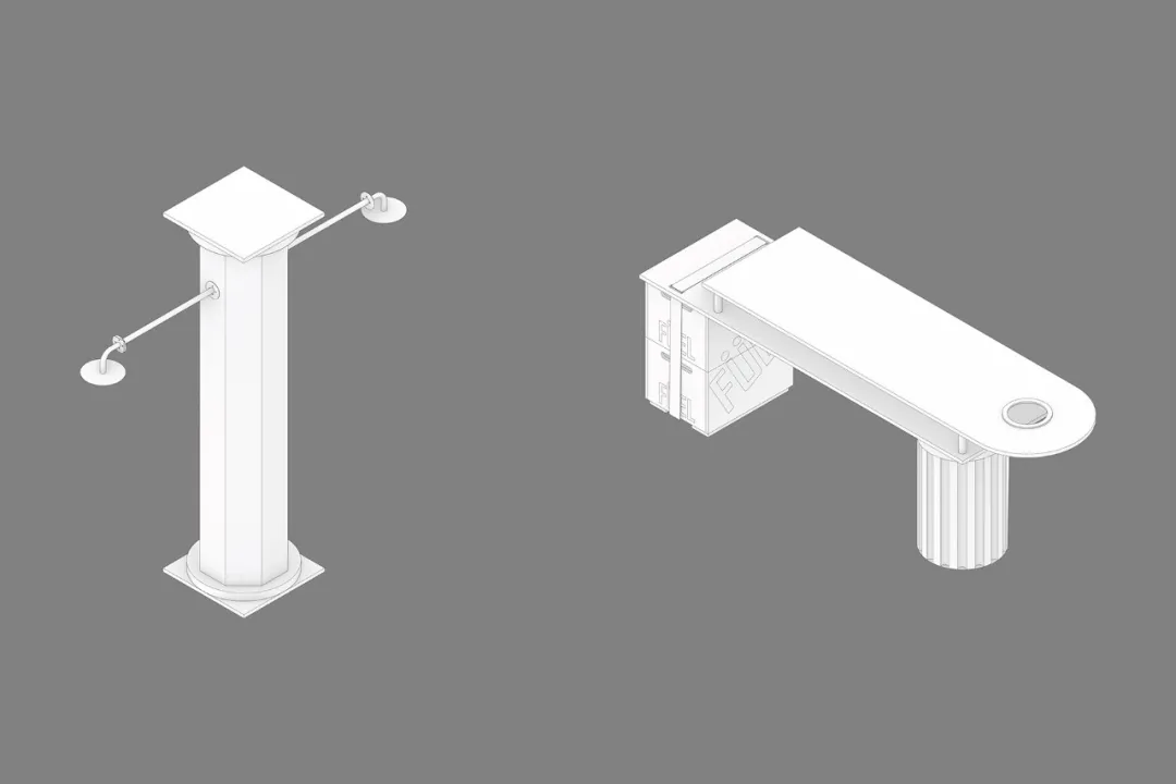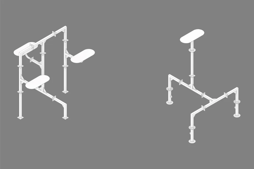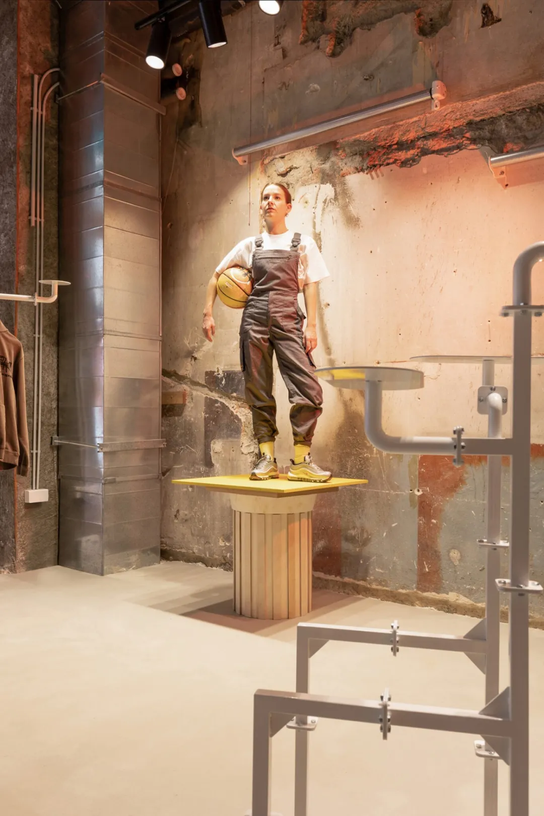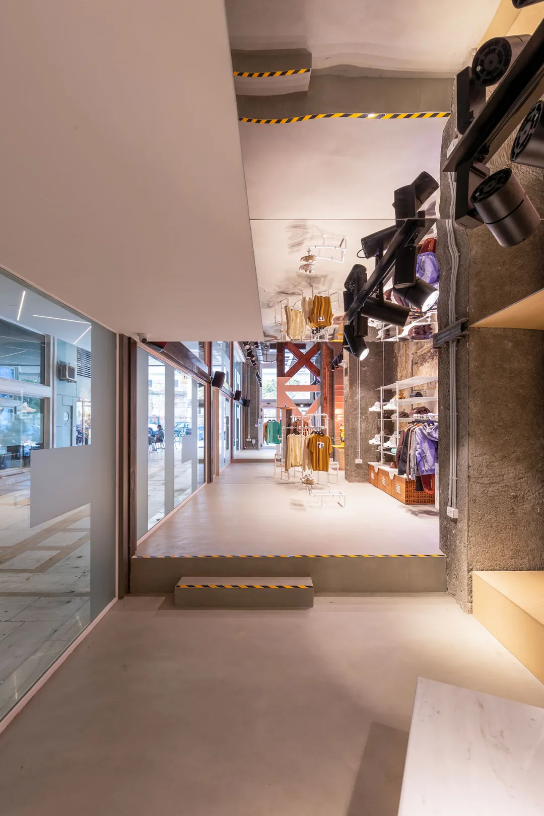 这家店位于“Megaron Pallados”,一个20世纪50年代初建立的具有纪念性的商业建筑中,“揭开”了建筑庄严外表下的原始状态。暴露的混凝土梁、钢桁架和未抹灰的干墙,配以穿过天花板的明管、管道和电缆托盘,以及一系列由基本建筑材料(如金属管、砖块和纤维板)制成的定制家具。结果是一个充满奇特惊喜、创意亮点和年轻、有点叛逆精神的动态空间,完美封装了FÜEL的街头时尚形象。——