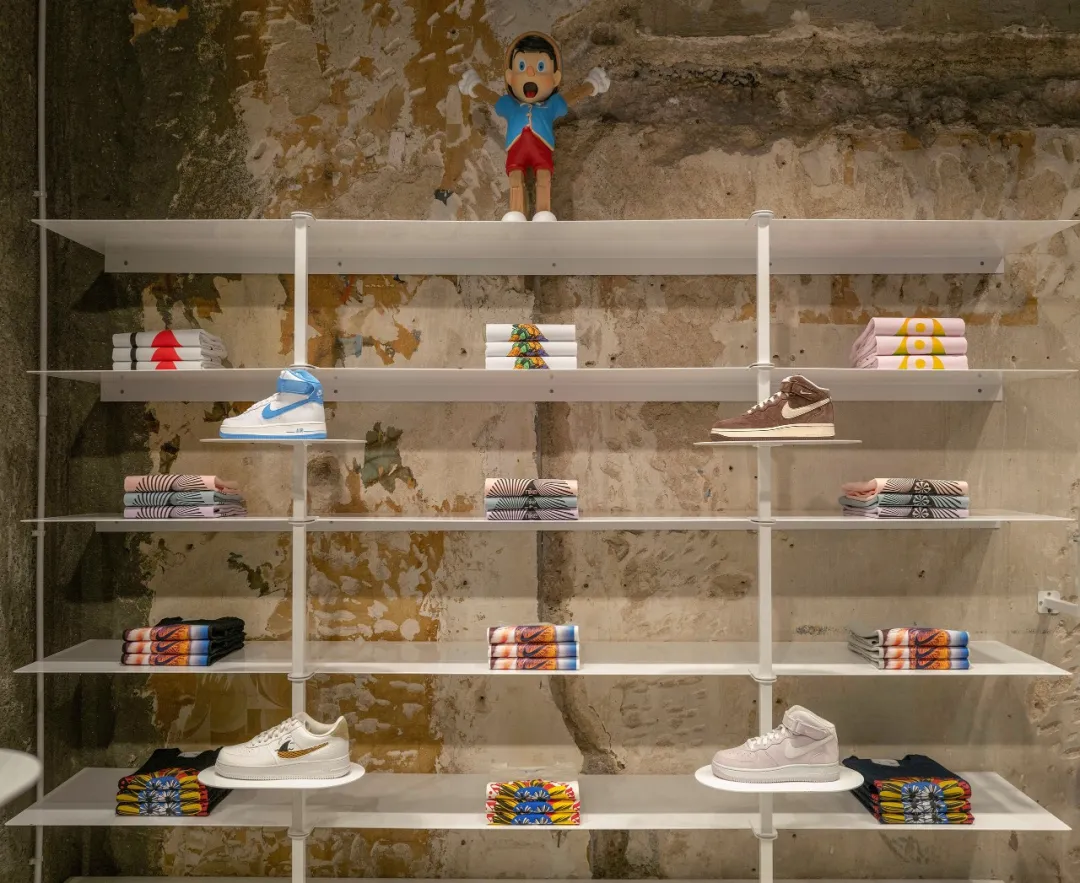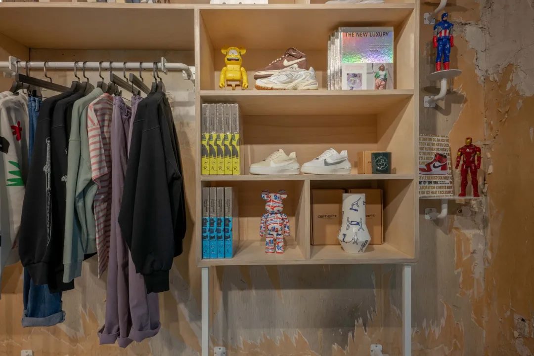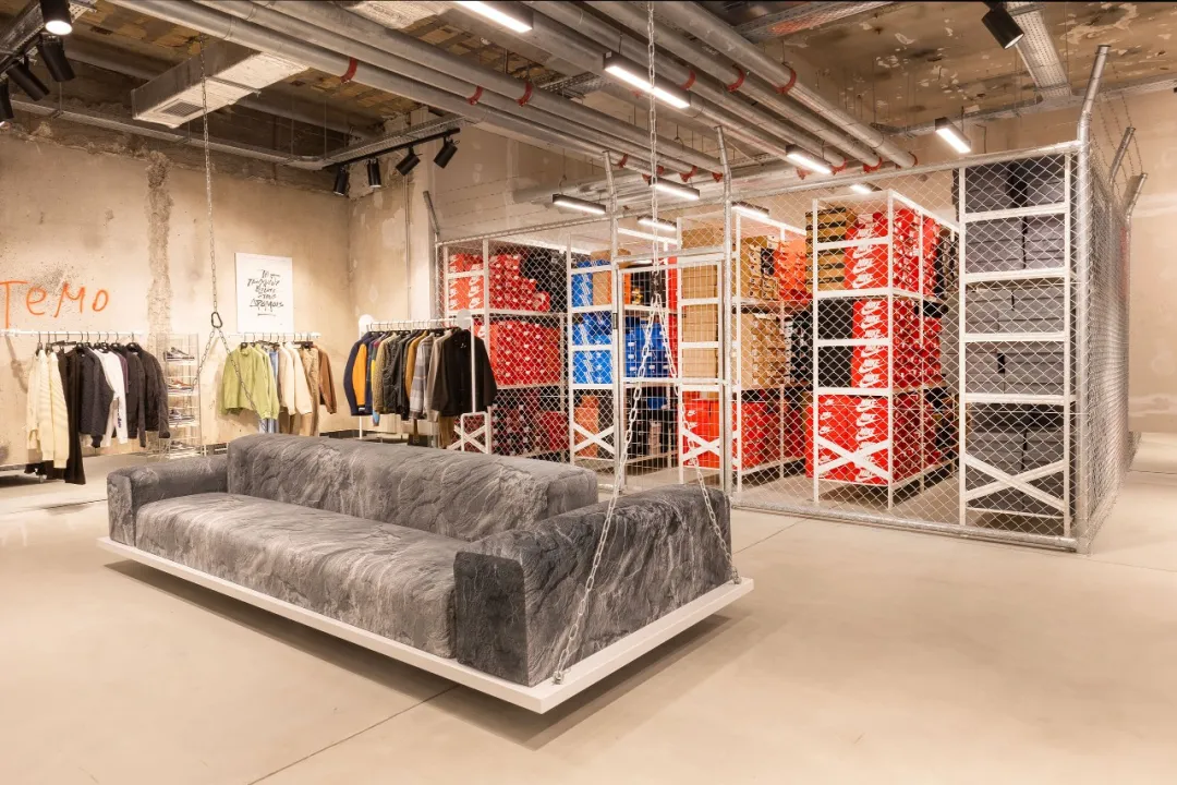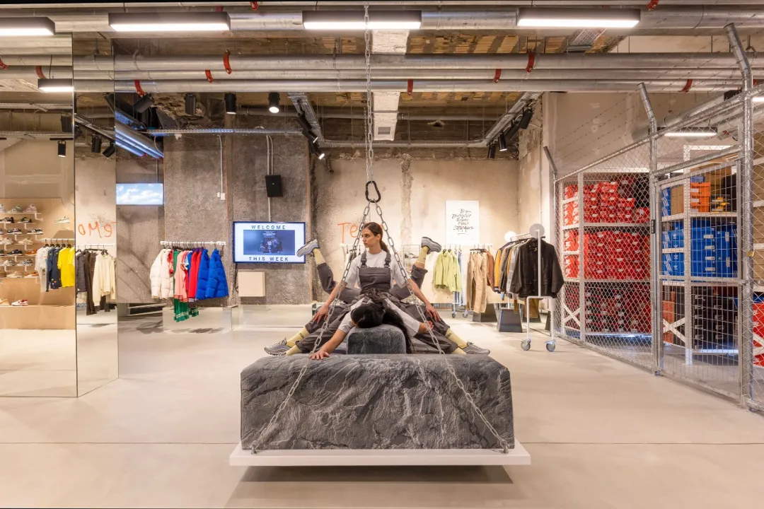 这些DIY风格的家具可能在精细度上有所欠缺,但在工艺、趣味性和多功能性方面,以及可持续性方面则大有裨益,因为店铺的建造最小化了塑料和其他不可回收材料的使用。例子包括一座似乎由起重机吊装的巨大仿花岗岩双面沙发、由两个巨型扬声器支撑大理石板的桌子、由砖块堆砌的柜台,以及一个由白色油漆管道组成的模块化展示系统,可以无限配置和塑形。波纹铝板,后者由链式围栏界定,这是对遍布雅典各个社区的户外运动场的致敬。这种类似高安全围栏的设置,故意给人一种存放珍贵商品的印象,这也是有原因的——FÜEL以出售收藏级运动鞋和NIKE、Adidas和New Balance等品牌的限量版合作产品而闻名,这些产品往往是专为希腊市场设计的。与主流的城市工业美学形成鲜明对比的是,一系列镜面、数字显示屏和LCD触摸屏,顾客可以使用它们进行店内和在线购物,这与品牌的科技驱动理念相一致,为空间注入了现代气息和奇迹感。而一些收藏级设计物品,尤其是来自日本的标志性玩具熊形象Bearbricks,以及一系列框装插图和艺术品,包括悬挂在主柜台上的伦勃朗《夜巡》复制品,增添了魅力、个性和风格。Studiomateriality的设计能力和FÜEL的精准策展让人赞叹,尽管视觉刺激和展示位众多,但店铺既不感觉压抑也不杂乱。相反,它提供了一个逐渐展开的体验,允许顾客按自己的节奏探索空间。凭借定期的布局变化和频繁的产品主题项目以及店内展览和活动,可以肯定的是,在FÜEL的旗舰店总有很多新东西等待发现。文章来源于Hi设计,版权归原作者所有,经小编整理后,与大家共同分享,明日更多商业地产精彩内容敬请期待,欢迎转发,感谢订阅。