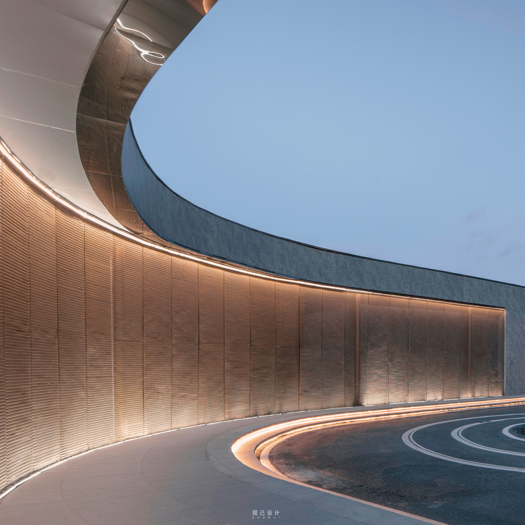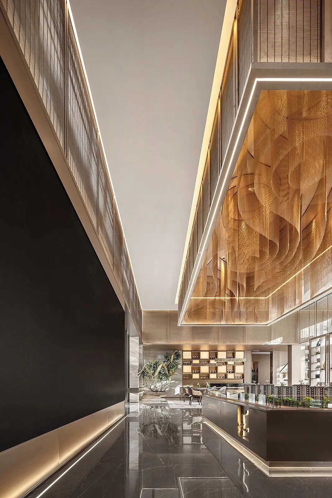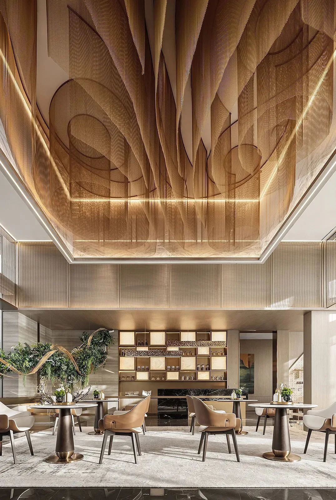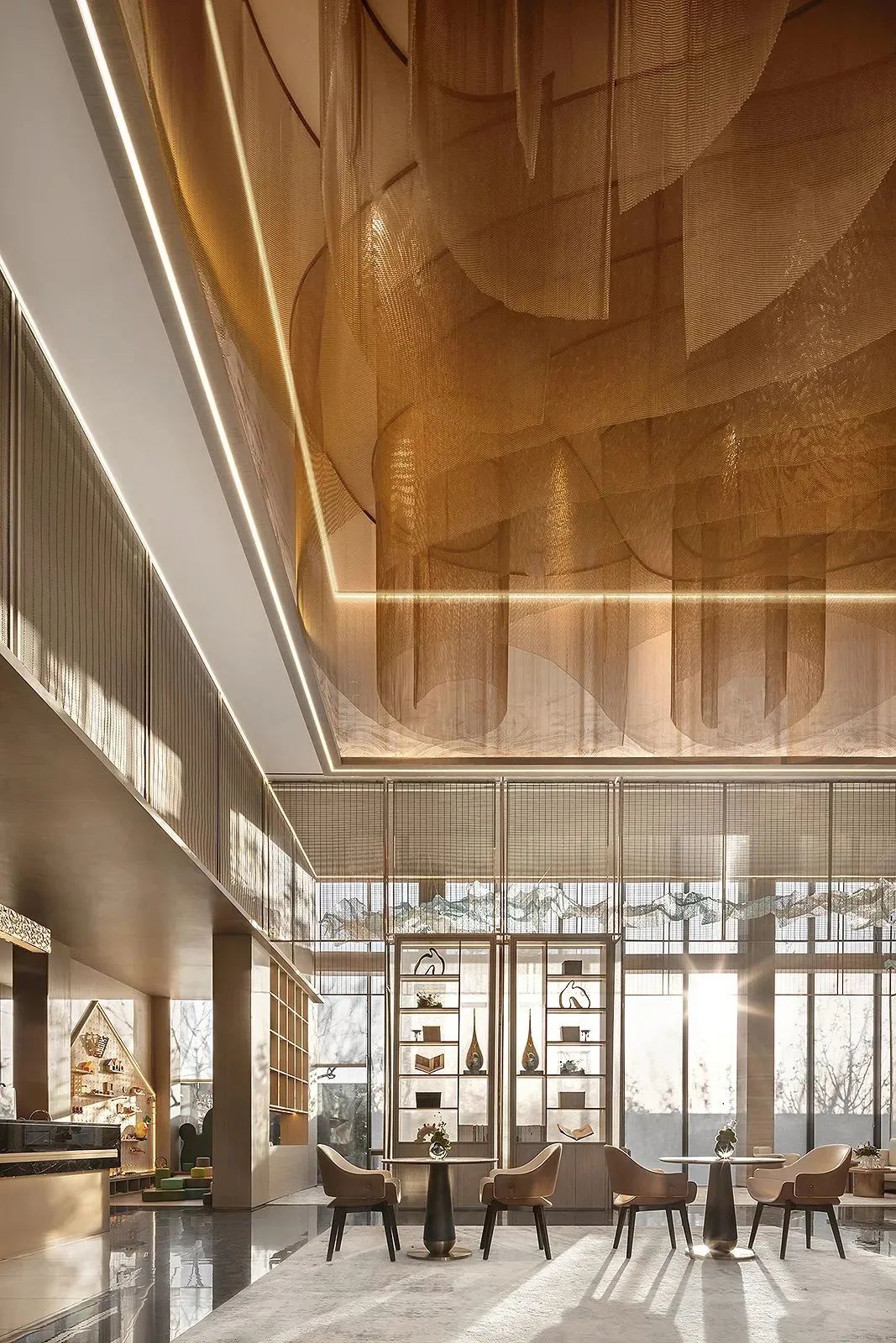 室内剔透的金属网悬吊艺术装置如恒河沙数般循着韵律流动,层峦叠嶂,映照着四周舒畅开阔的长河华幅。
