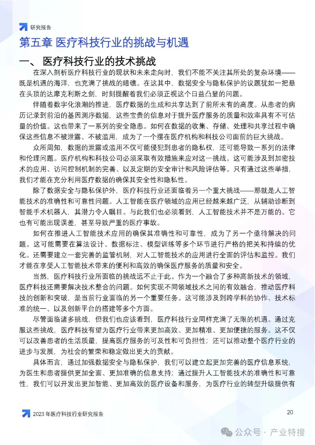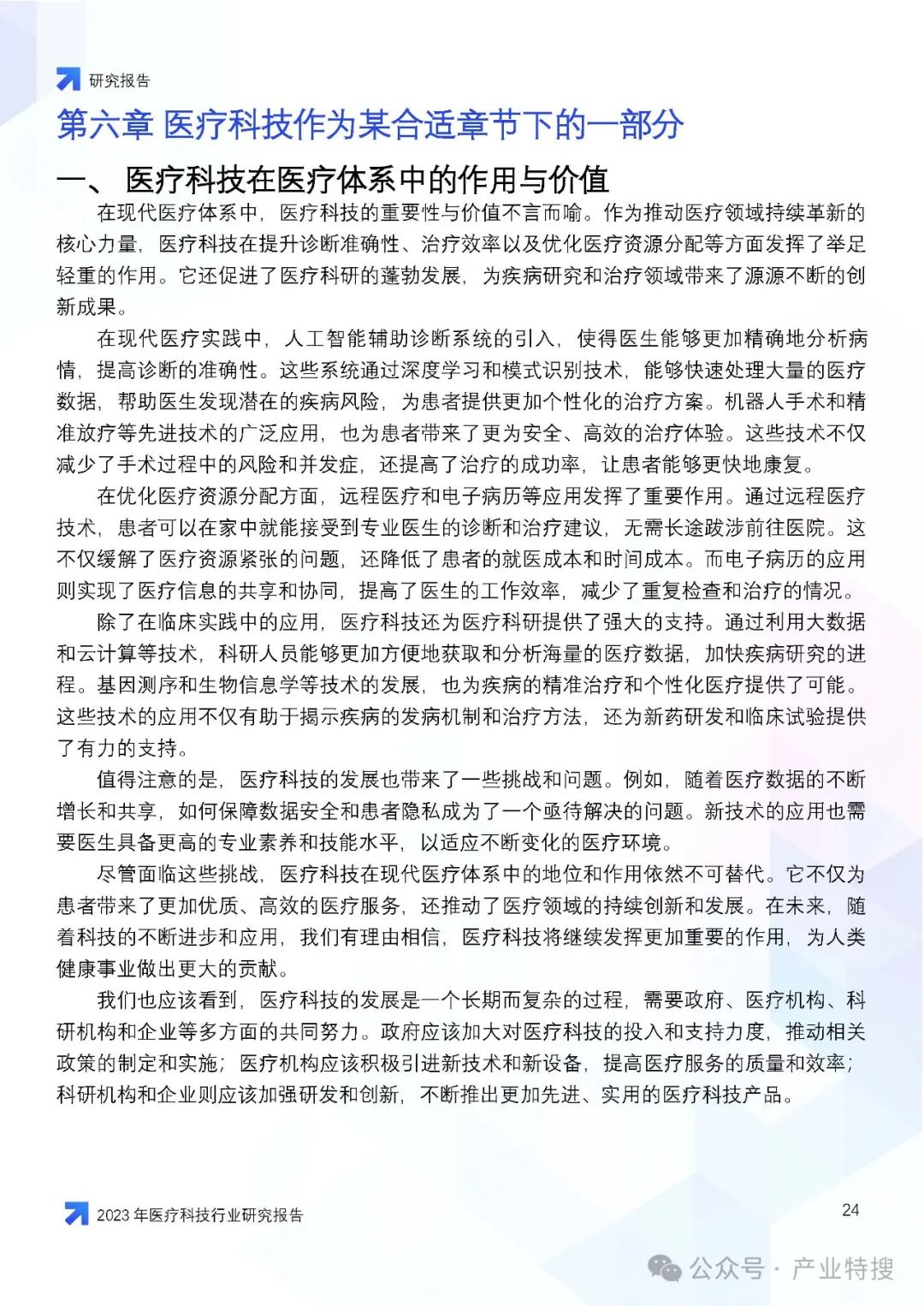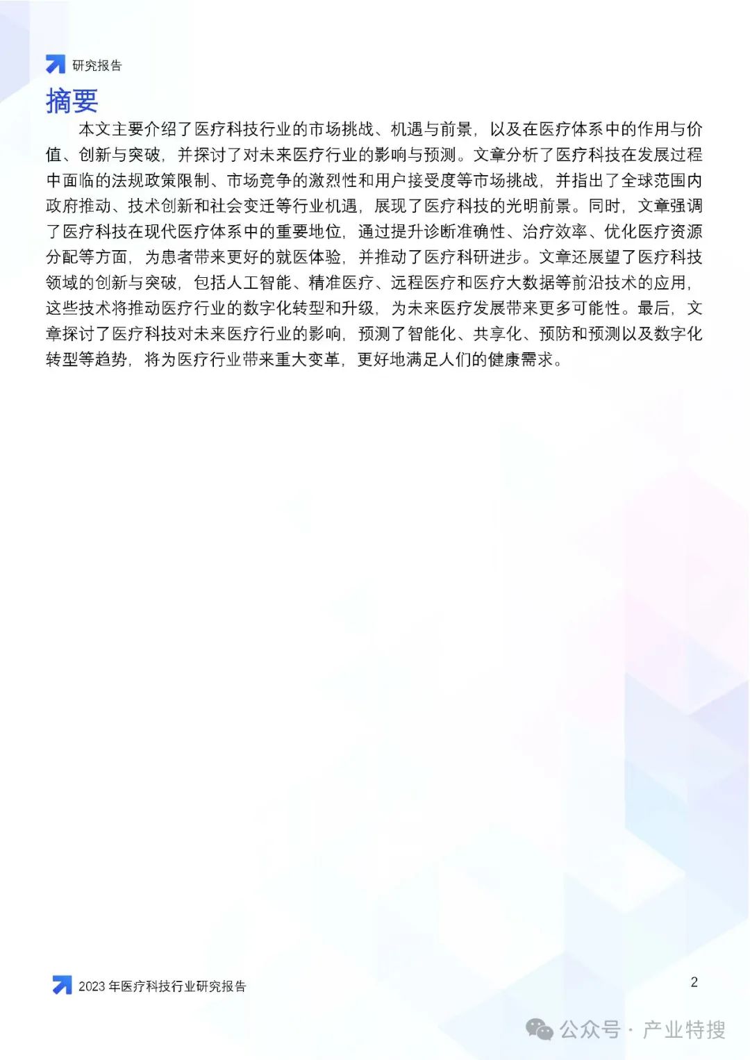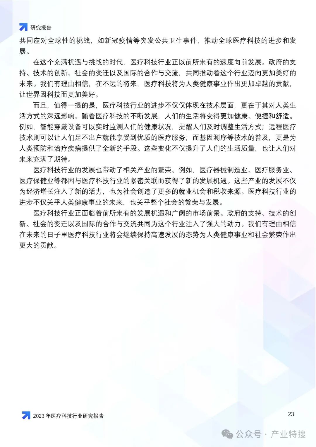 这份文件是一份关于2023年医疗科技行业的研究报告,主要探讨了医疗科技行业在市场挑战、机遇与前景方面的情况,以及医疗科技在医疗体系中的作用、价值、创新与突破,并对未来医疗行业的影响和趋势进行了预测。以下是报告的核心内容概述: