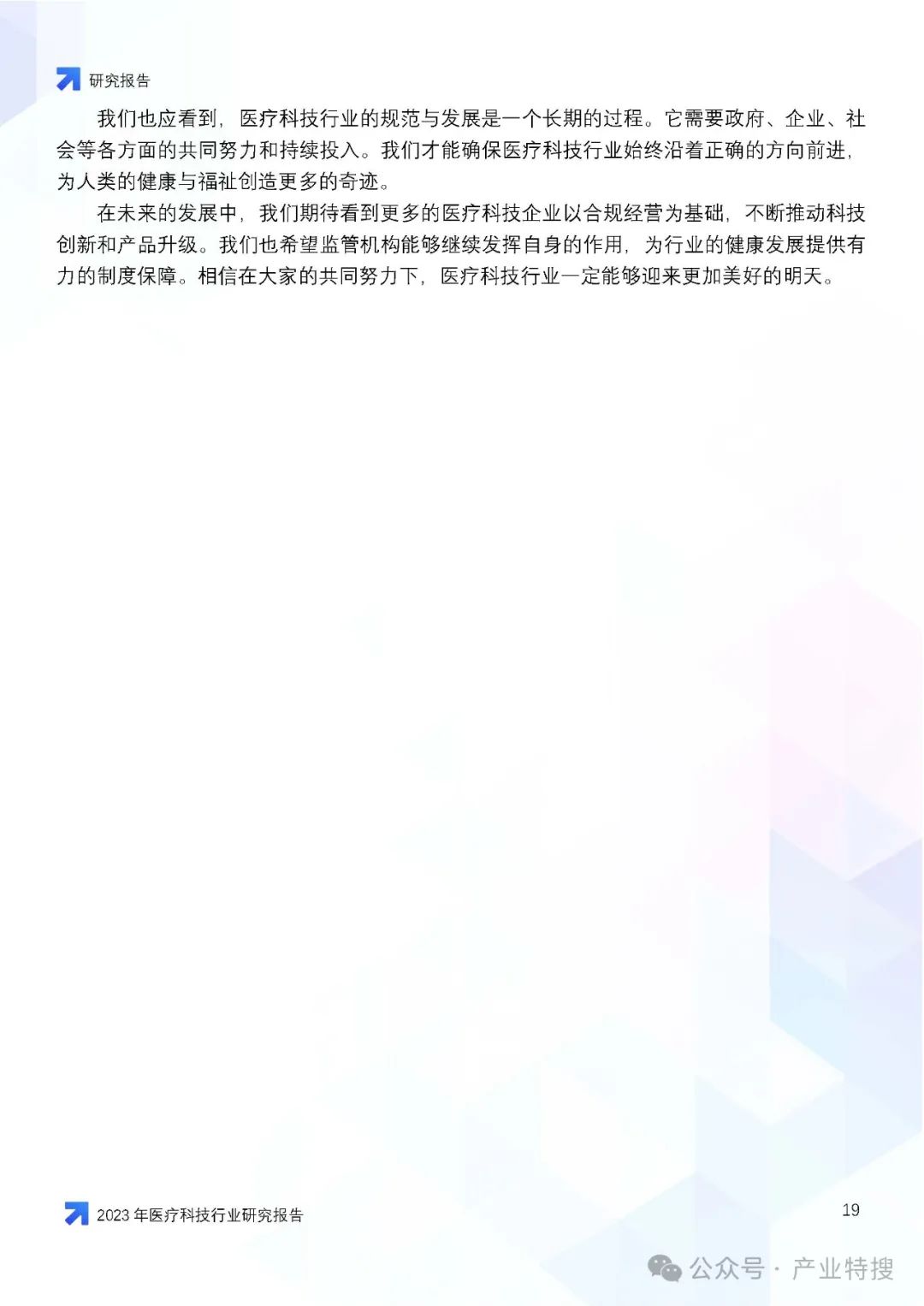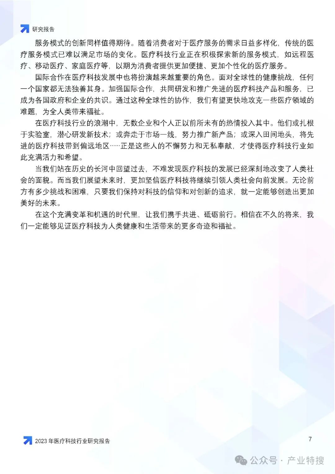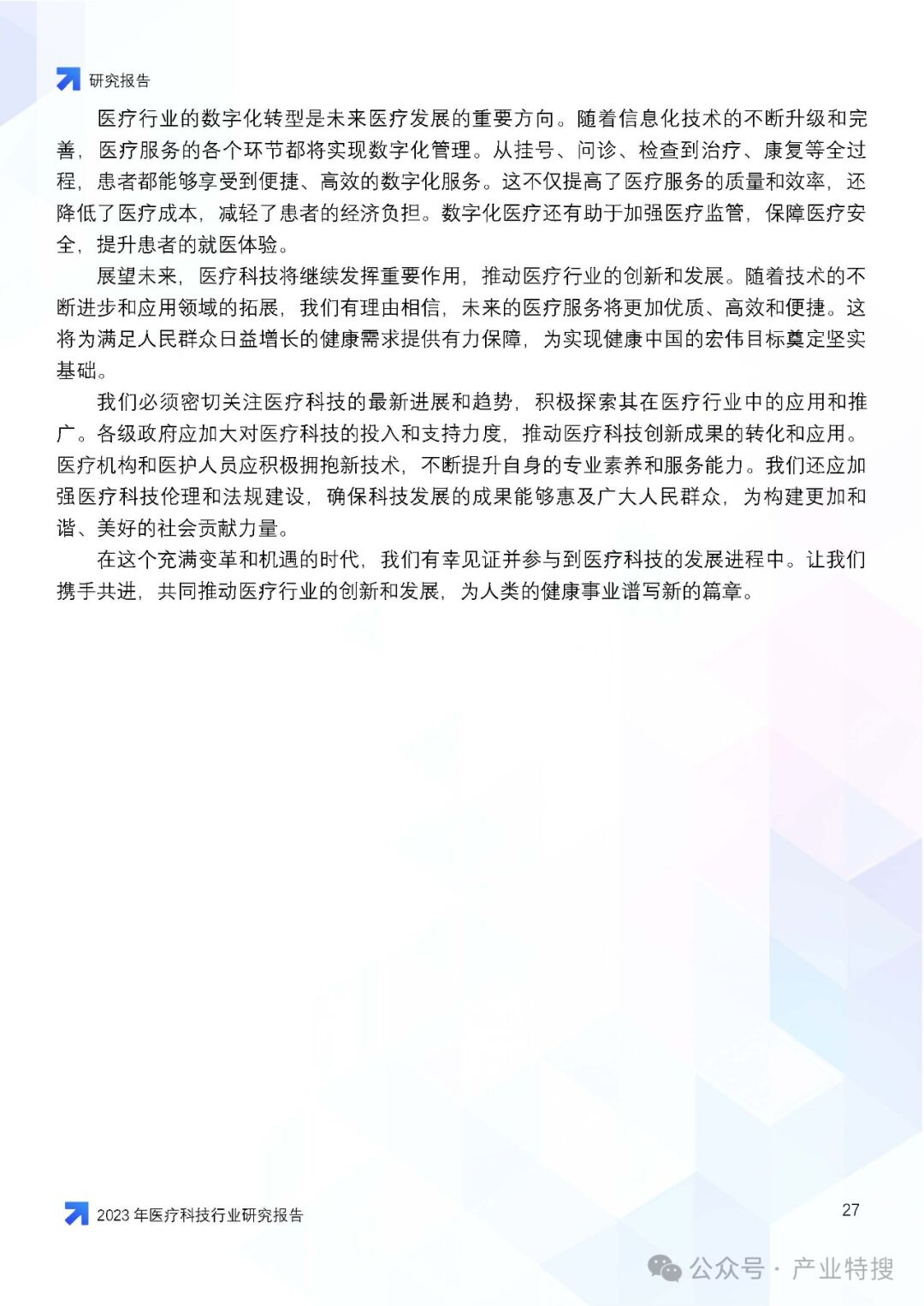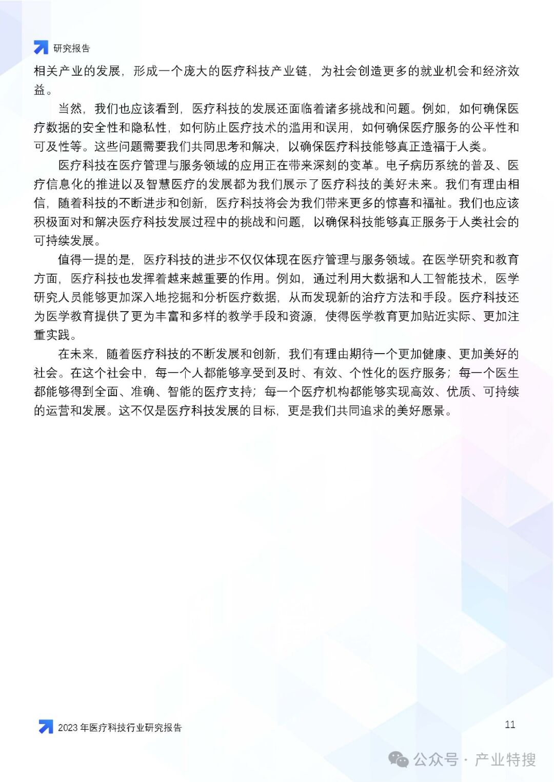 这份文件是一份关于2023年医疗科技行业的研究报告,主要探讨了医疗科技行业在市场挑战、机遇与前景方面的情况,以及医疗科技在医疗体系中的作用、价值、创新与突破,并对未来医疗行业的影响和趋势进行了预测。以下是报告的核心内容概述: