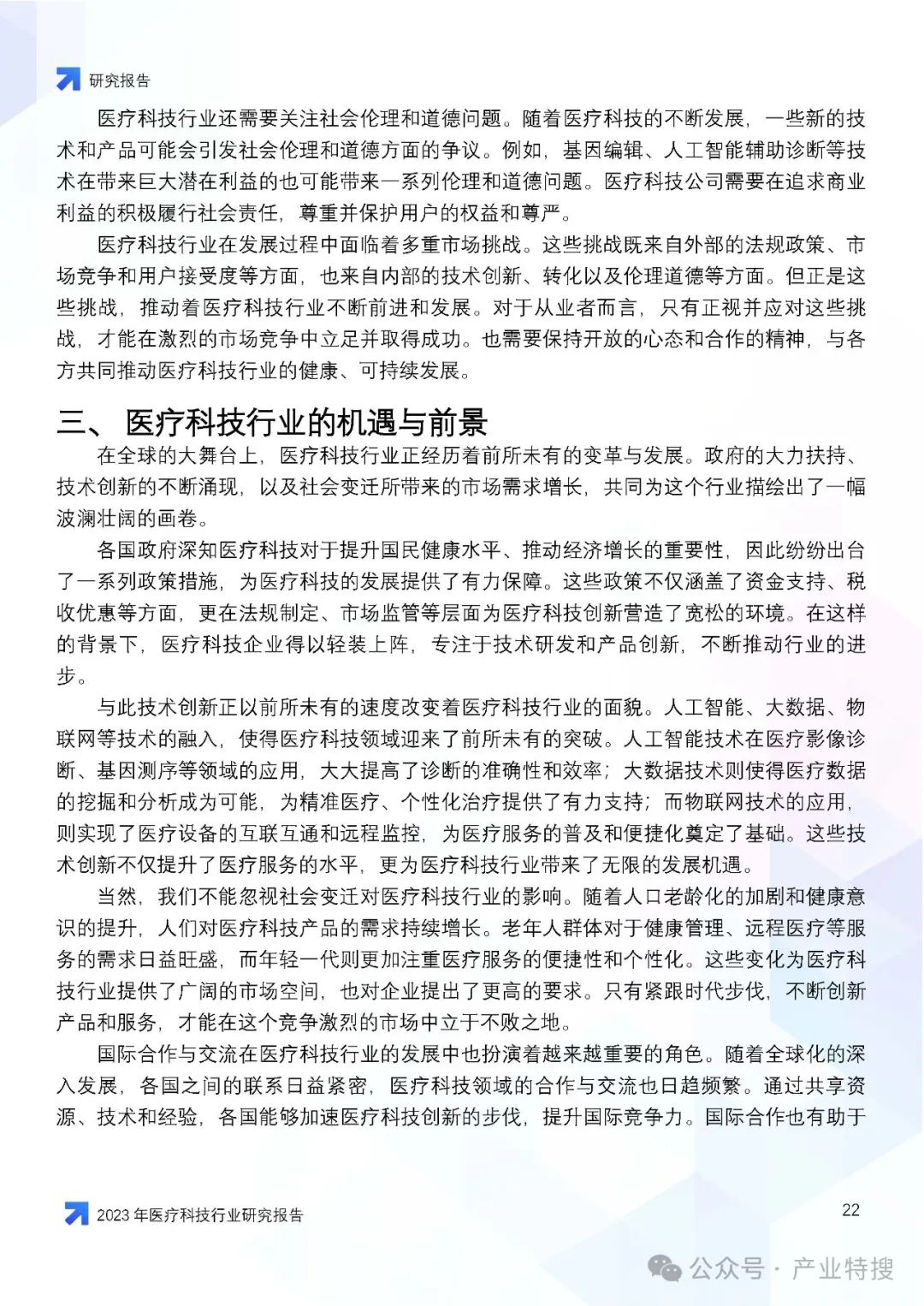 - 机遇与前景:政府推动、技术创新和社会变迁为医疗科技行业带来了广阔的发展前景。