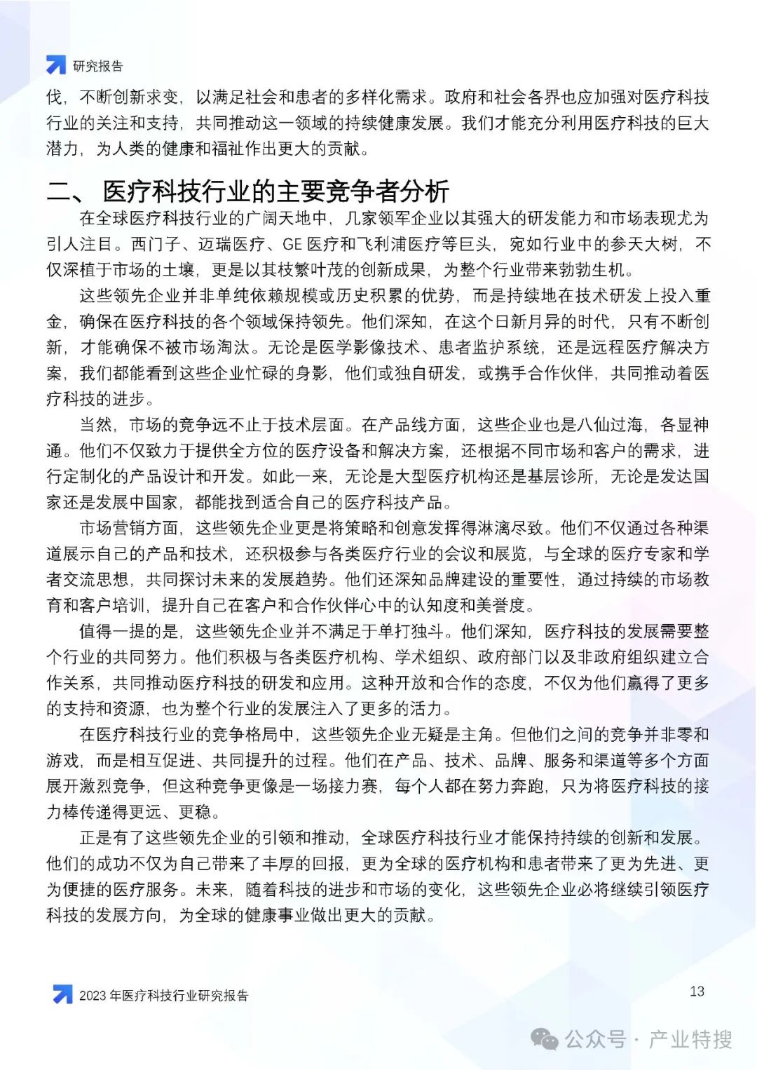 - 竞争者分析:西门子、迈瑞医疗、GE医疗和飞利浦医疗等领先企业在技术研发和市场表现上占据优势。