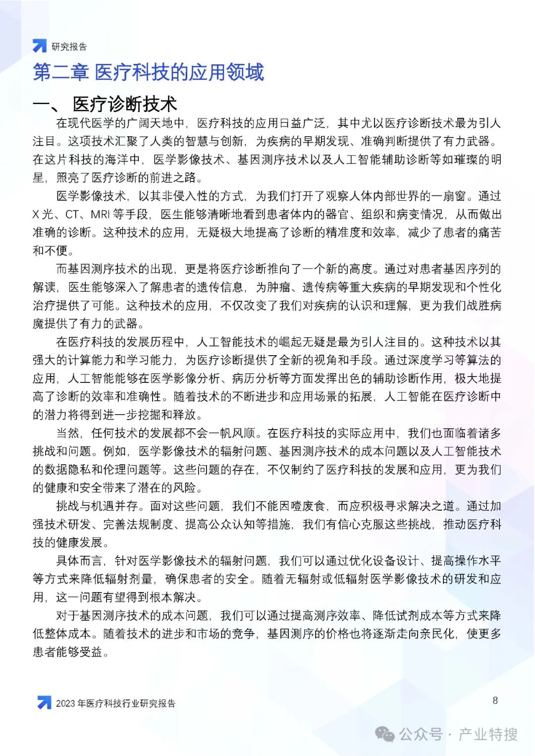 - 医疗诊断技术:医学影像技术、基因测序技术和人工智能辅助诊断等技术的应用提高了诊断的准确性和效率。