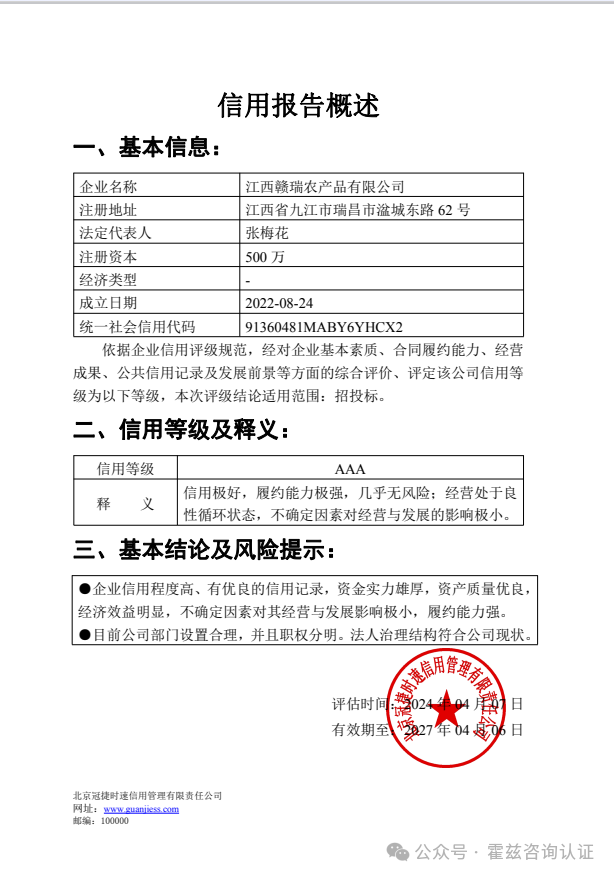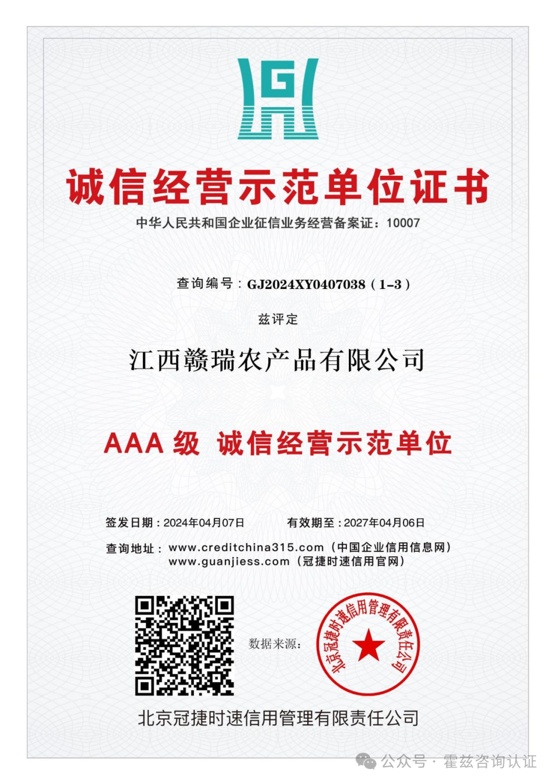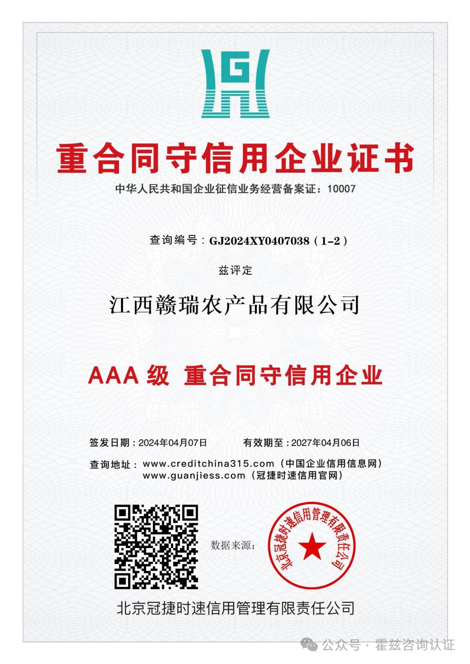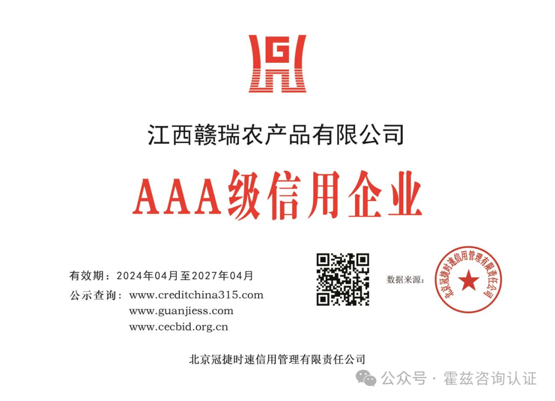 “AAA级企业信用等级证书”代表了企业信用的最高等级。近日,江西赣瑞农产品有限公司经我司济南霍兹信息科技有限公司团队的专业服务下,于2024年04月07日获得了由北京冠捷时速信用管理有限责任公司颁发的“AAA级企业信用等级”、“AAA级质量服务信誉单位”等多项荣誉。
