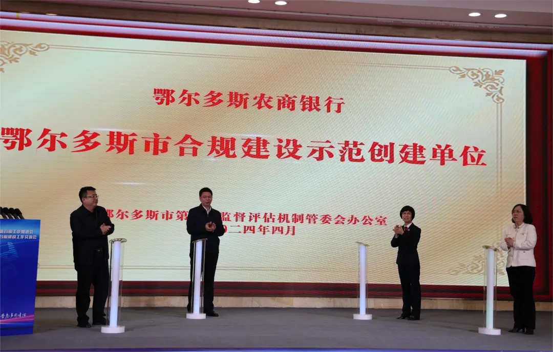 ▲会上举行了鄂尔多斯市合规建设示范创建单位揭牌仪式。会上,举行了鄂尔多斯市合规建设示范创建单位揭牌仪式。经市涉案企业合规第三方监督评估机制管委会办公室推荐,将鄂尔多斯农村商业银行确定为鄂尔多斯市合规建设示范创建单位。