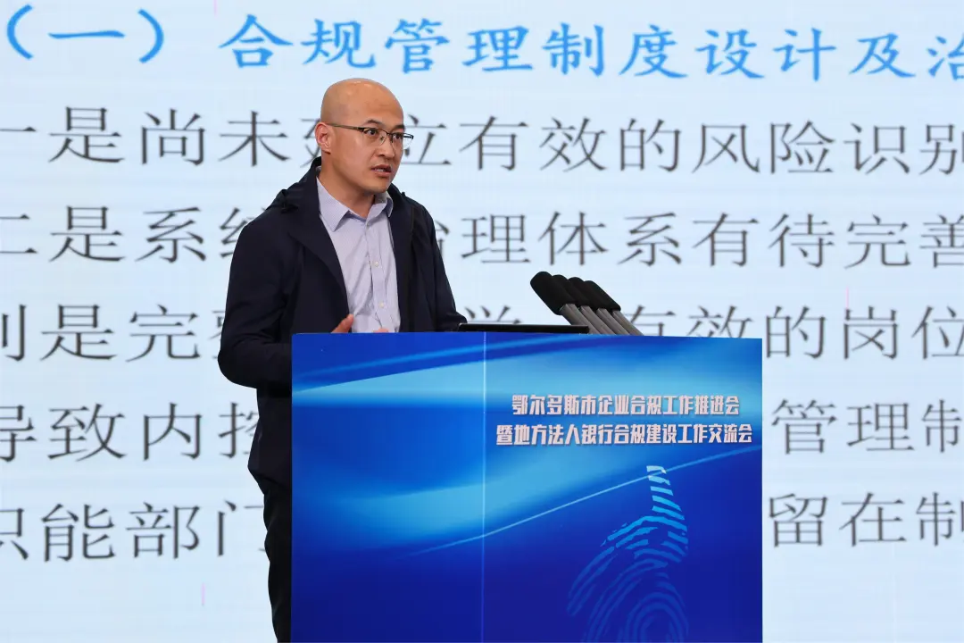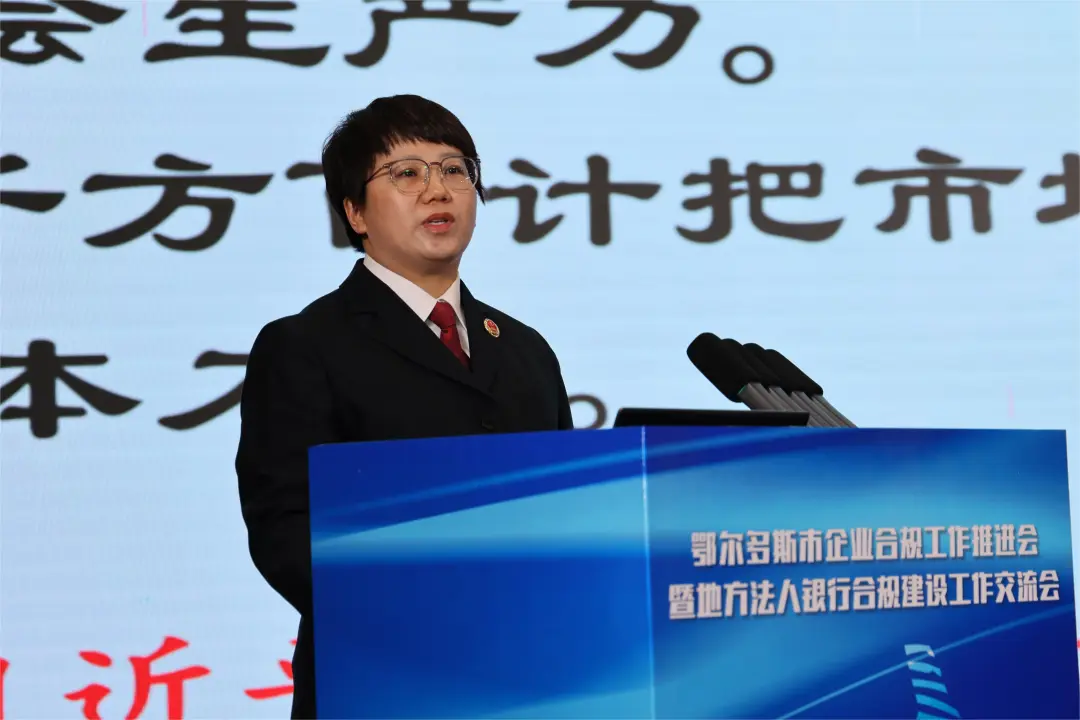 ▲鄂尔多斯农村商业银行股份有限公司党委书记 、董事长李文君作企业合规主体典型发言。