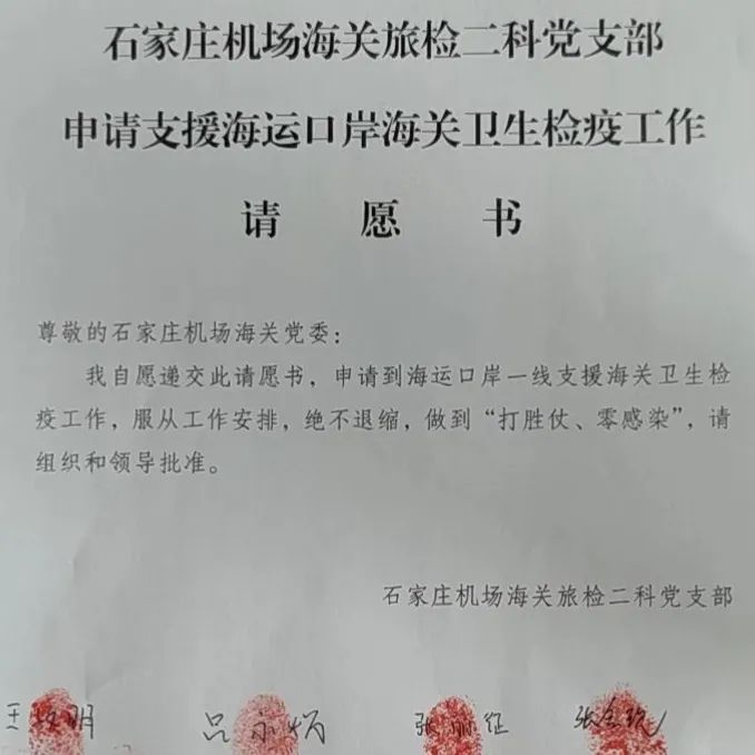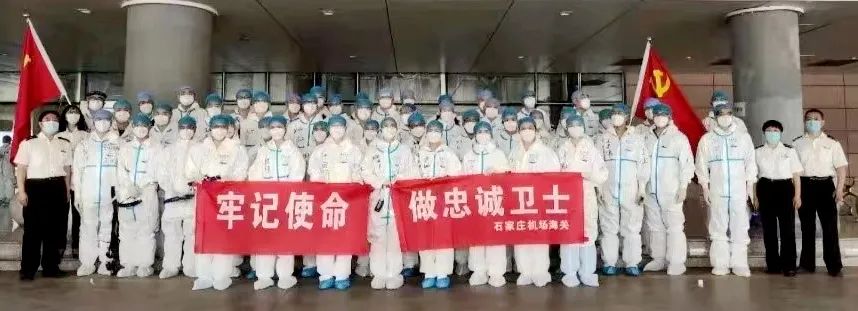 在石家庄机场受本地疫情影响,暂停国际航班的时间里,党支部全体党员培训不断、考核不断、演练不断。在总关党委和机场海关党委的号召下,党支部全体党员递交请愿书,支援兄弟海关疫情防控一线工作,以实际行动践行了“让党旗始终在抗疫一线高高飘扬”。