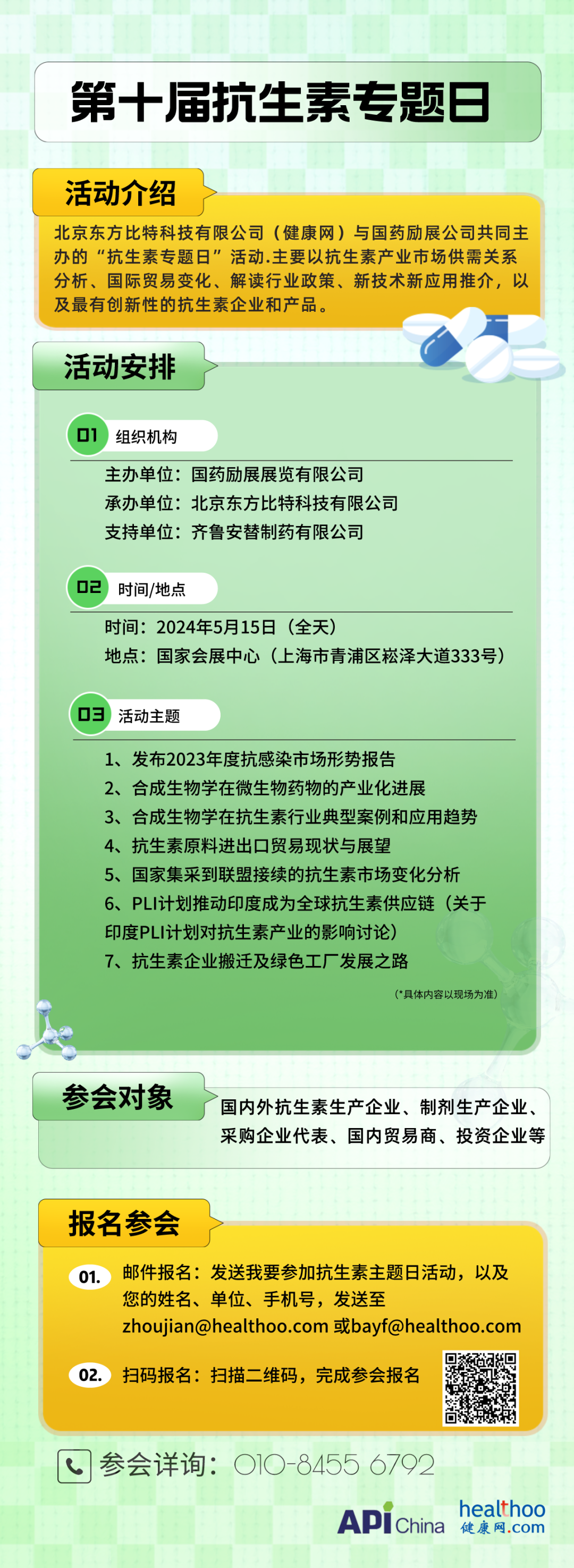 素有中国制药风向标之称的“API China”展会,在每届展会同期,会与北京东方比特科技有限公司(健康网)共同主办的“抗生素专题日”活动,多年来抗生素主题日活动已在业内形成品牌和长期稳定的参与者;为此,在2024年5月15-17日的第90届中国国际医药原料药中间体展会(上海)期间主办方再度举办“第十届抗生素主题日活动”。本届主题日活动继续以抗感染药市场、技术、政策为核心,包括原料药出口情况、企业格局变化等;同时关注到在集采对抗生素原料药和制药企业未来走势影响。另外,近些年合成生物学在抗生素原料生产中应用的关注和需求更加迫切。抗生素制剂市场在全国性的“集采”实施后使供应链渠道和营销方式发生根本性改变,下游制剂端对原料药、辅料等配套采购需求越来越集中到中标企业。供应关系重要性更加复杂,凸显了供应链一体化的重要性。