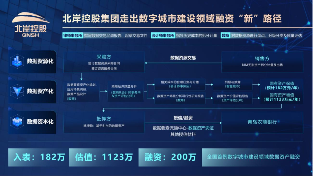 近日,青岛北岸控股集团凭借在数字城市建设过程中积累的数据资产成功获得银行融资,实现全国首例数字城市建设领域数据资产融资,首笔数据资产质押贷款200万元已于2024年3月29日发放完毕。