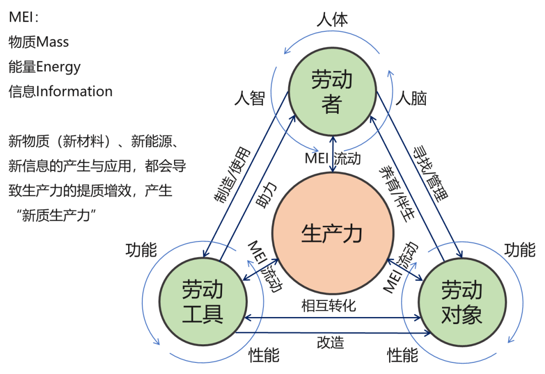由图2,在劳动者、劳动工具、劳动对象三要素之间,一直彼此流动着物质、能量和信息(MEI),三要素之间彼此相互作用,甚至相互转化(如:劳动工具↔劳动对象),MEI之间其实也是相互作用、彼此转化的。三要素+MEI所体现出来的相互作用与彼此转化,带来了劳动者、劳动工具和劳动对象的持续变革和升级,导致对MEI的更为有效的利用和相互转化,让生产力的实现载体、表现形式、利用效率、内涵外延都发生了巨大变革,甚至是颠覆性创新,由此而迸发出相对于原有生产力的“新质生产力”。这应该是对新质生产力产生机理的一种探索和解读。